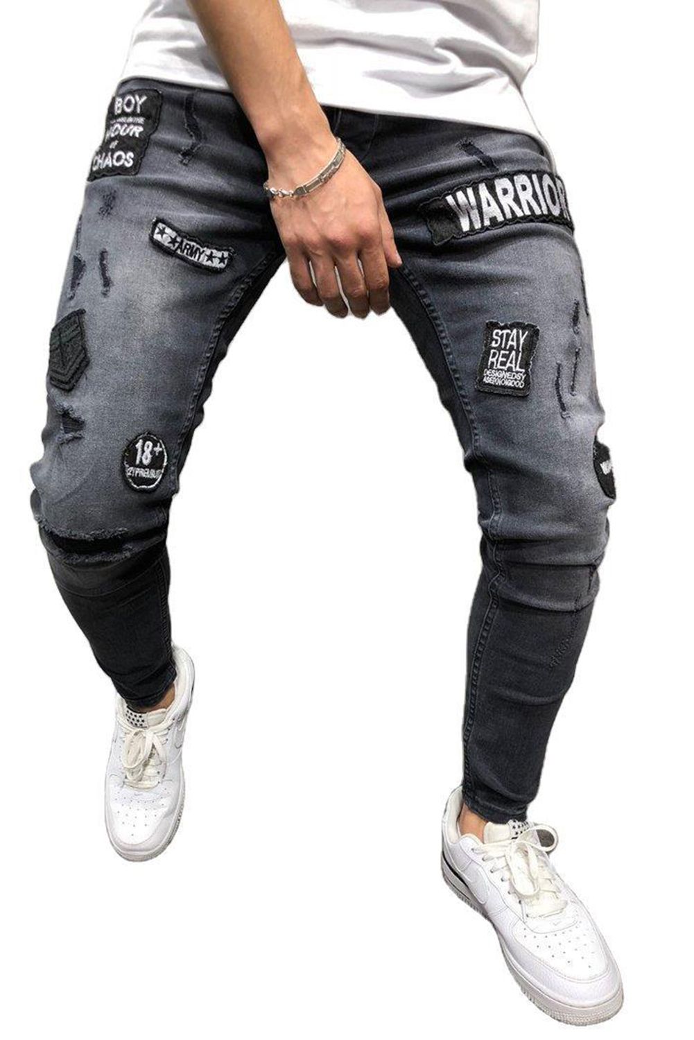 Men's Black Ripped Badge Applique Stiletto Jeans