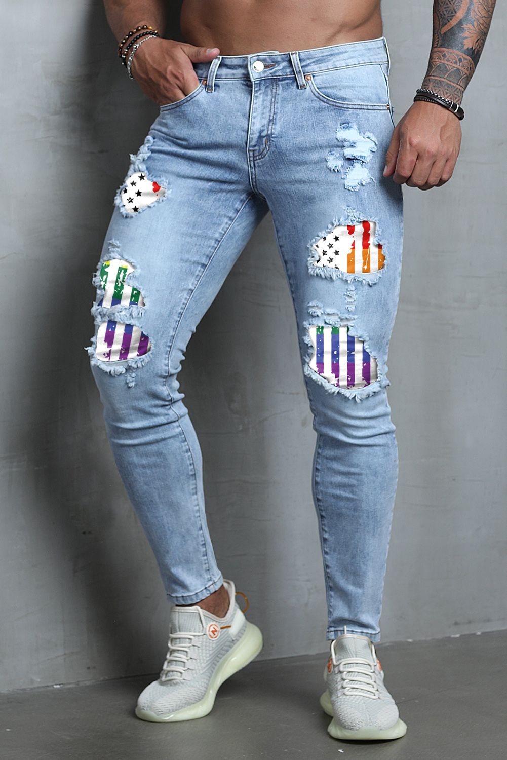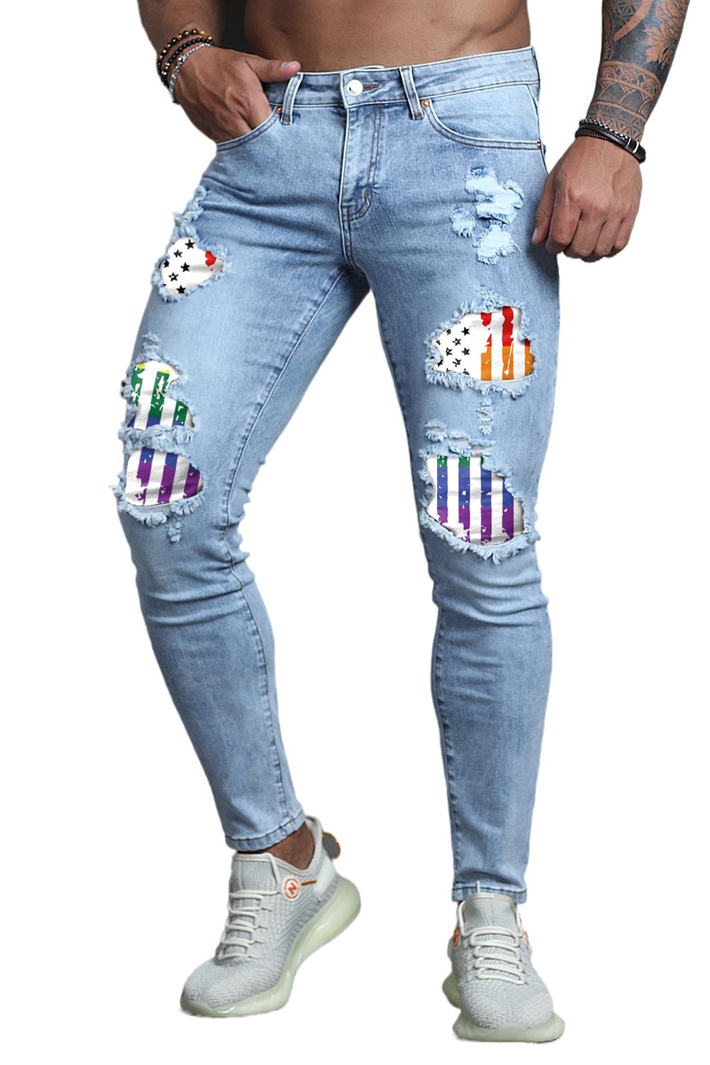 Multicolor Stripes and Stars Print Ripped Skinny Jeans