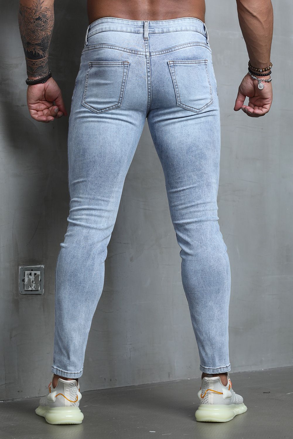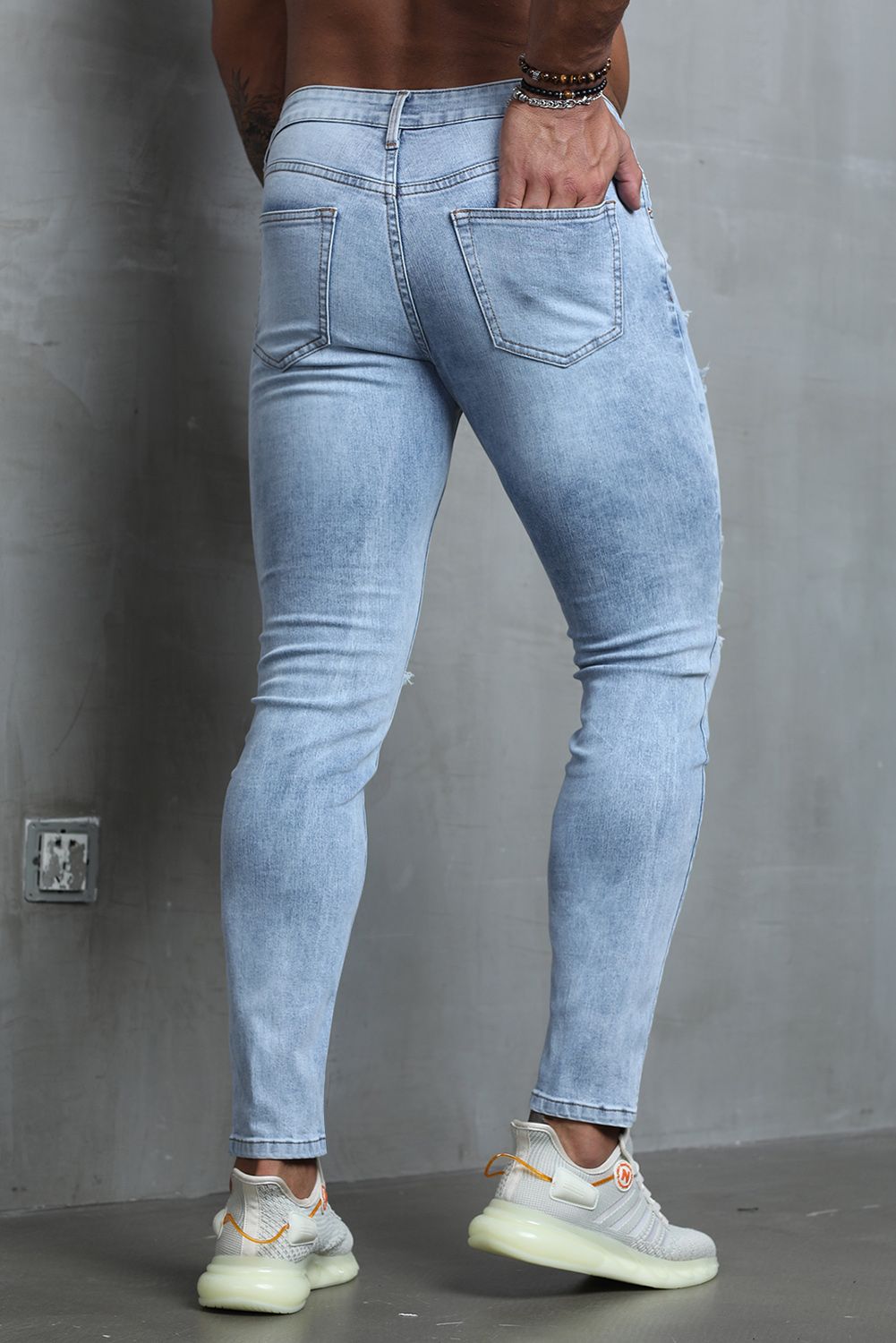 Sky Blue Men Stripes and Stars Print Ripped Skinny Jeans