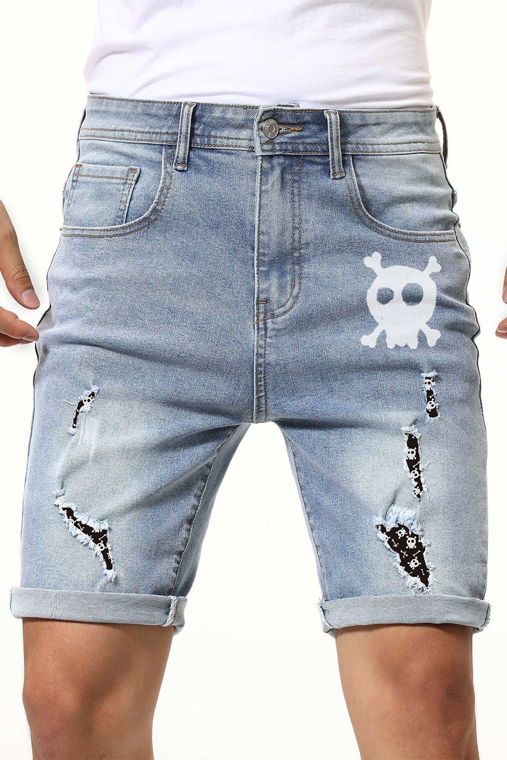 Sky Blue Skull Print Rolled Hem Ripped Men's Denim Shorts