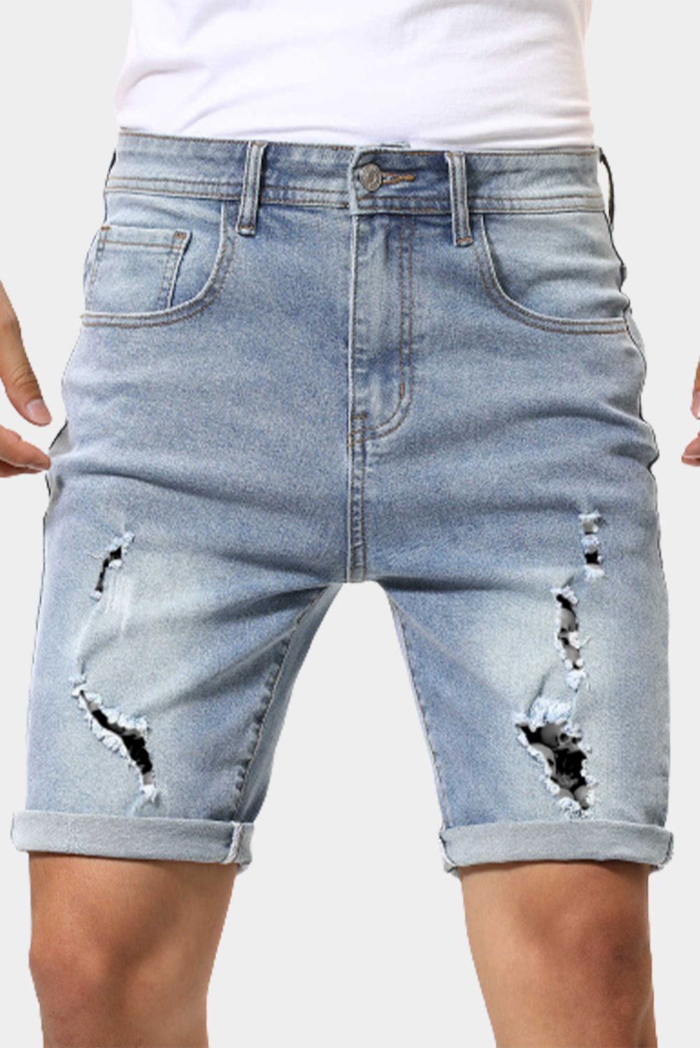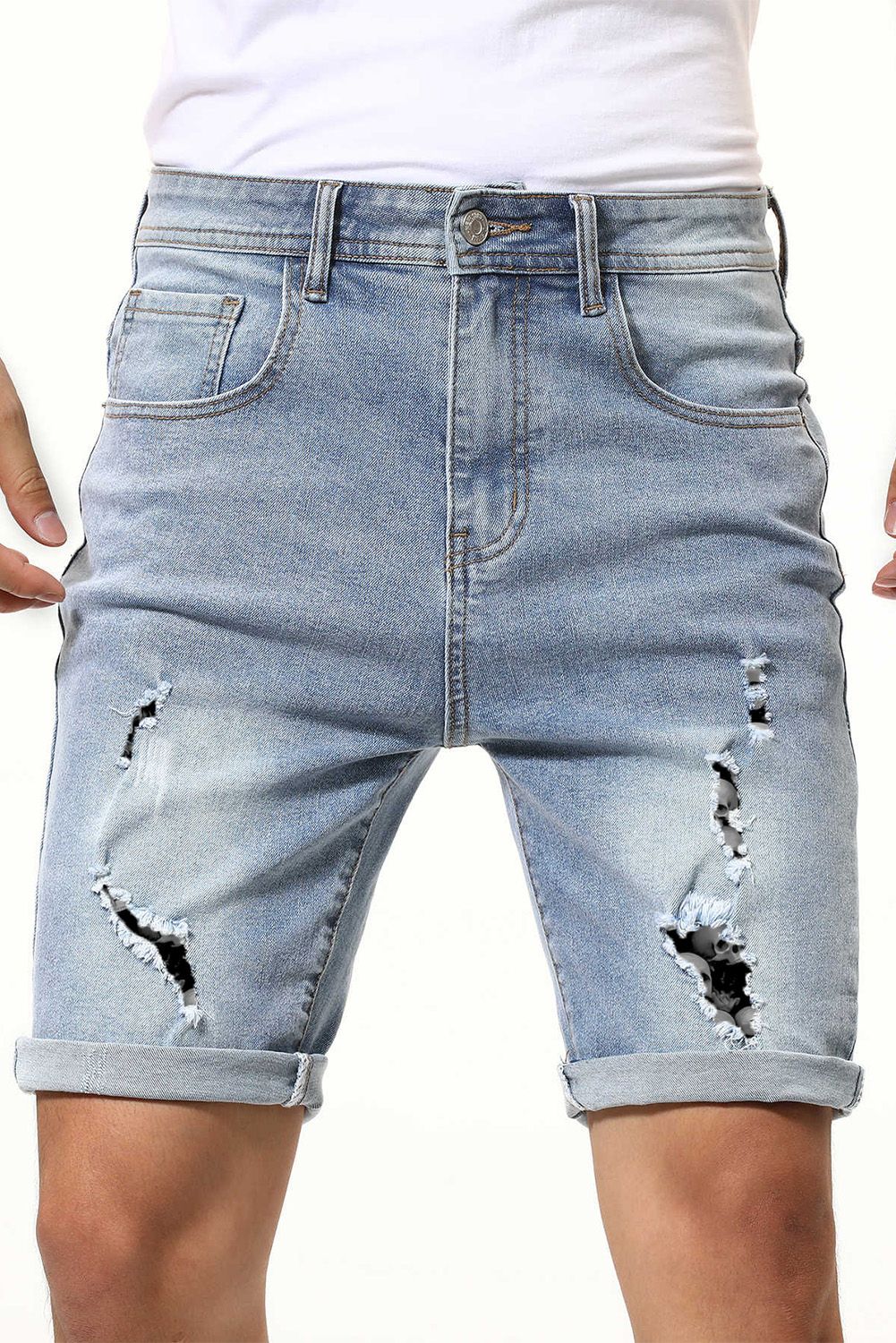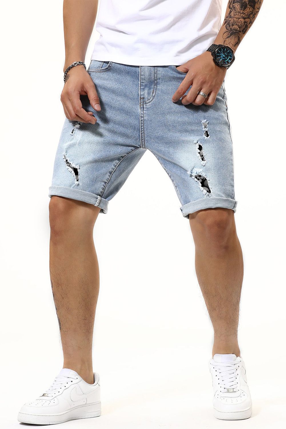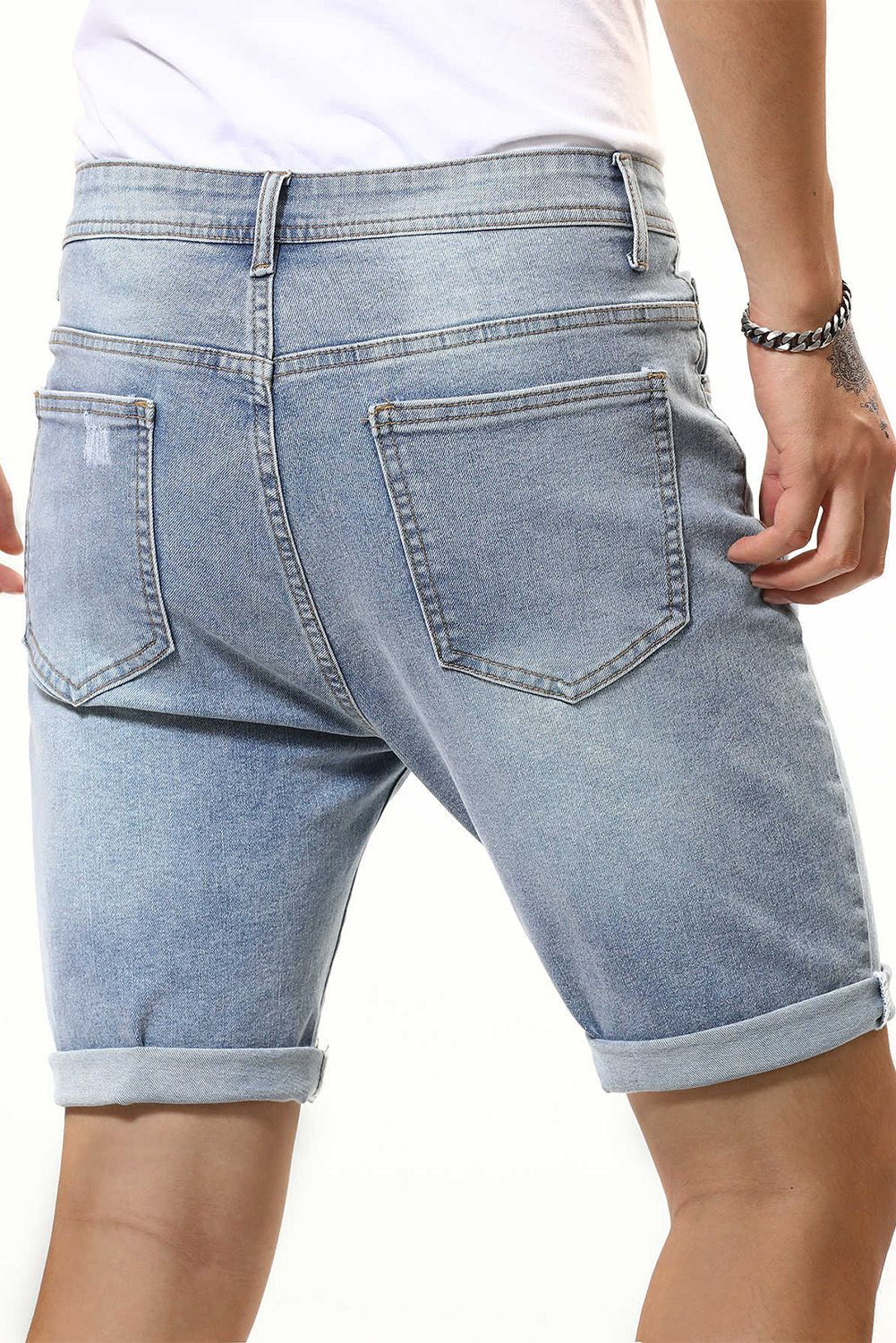 Sky Blue Skulls Graphic Patchwork Rolled High Waist Men's Denim Shorts
