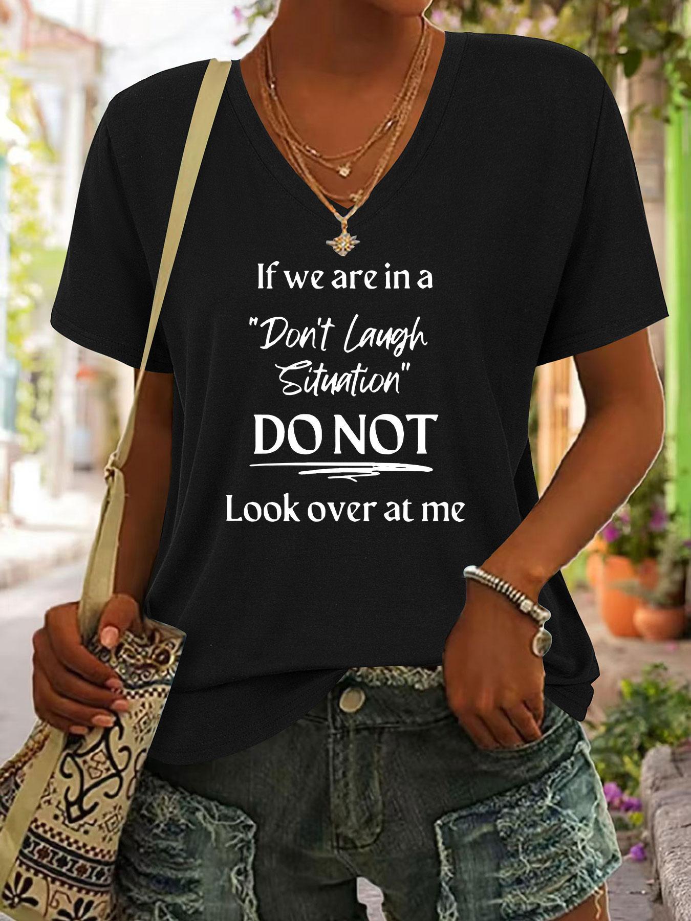 Women'S Casual V-Neck T-Shirt with "If We Are in a " Don't Laugh Situation DO NOT Look Over at Me" Print, Soft Fabric, Short Sleeve Top for Spring/Summer/Fall, Casual Summer Top | Humorous Graphic Tee | Soft Fabric Top