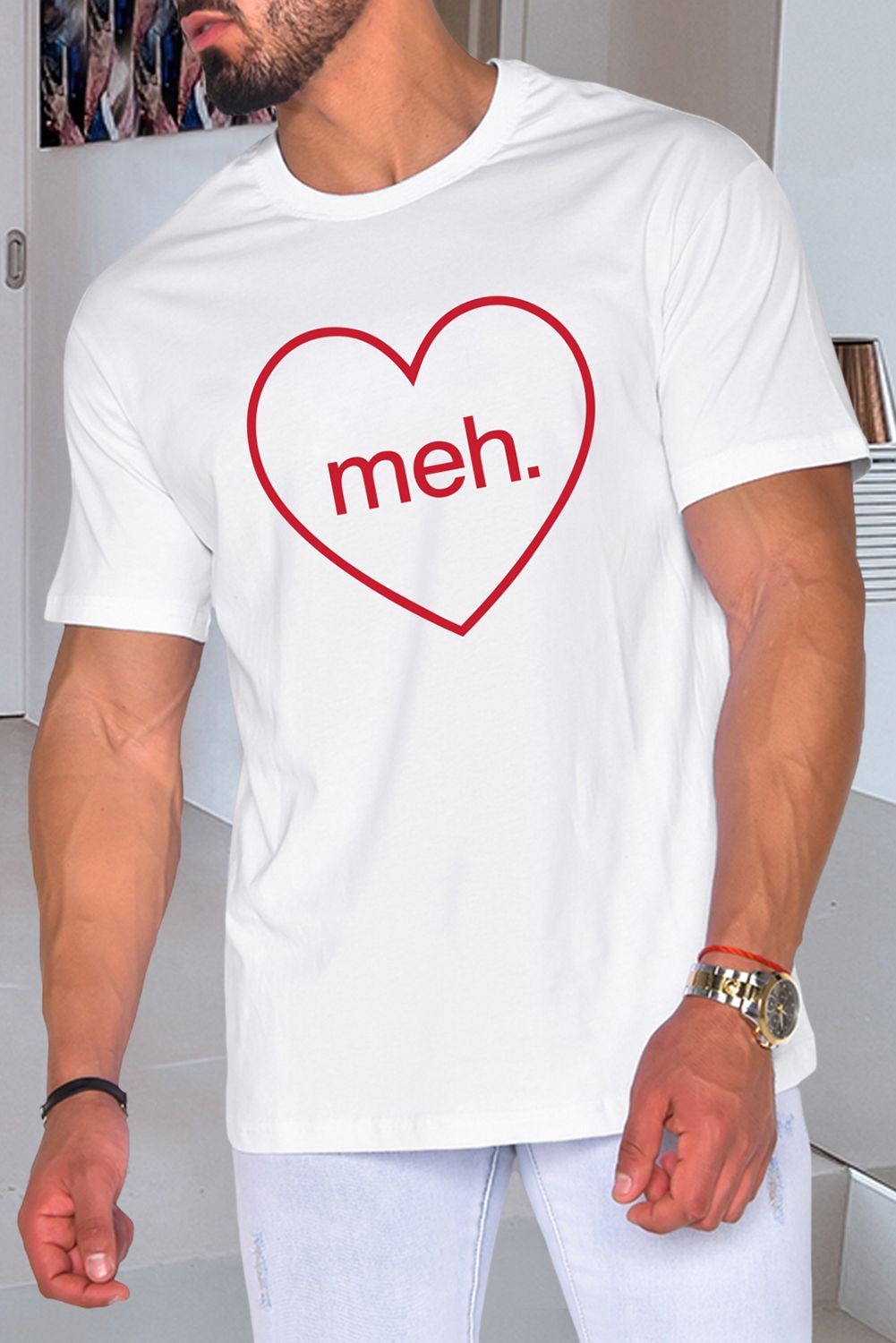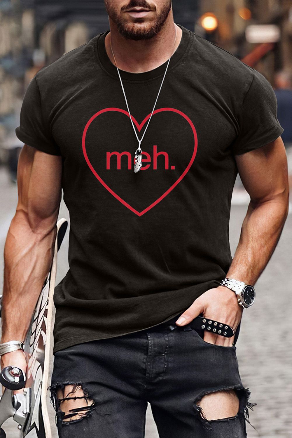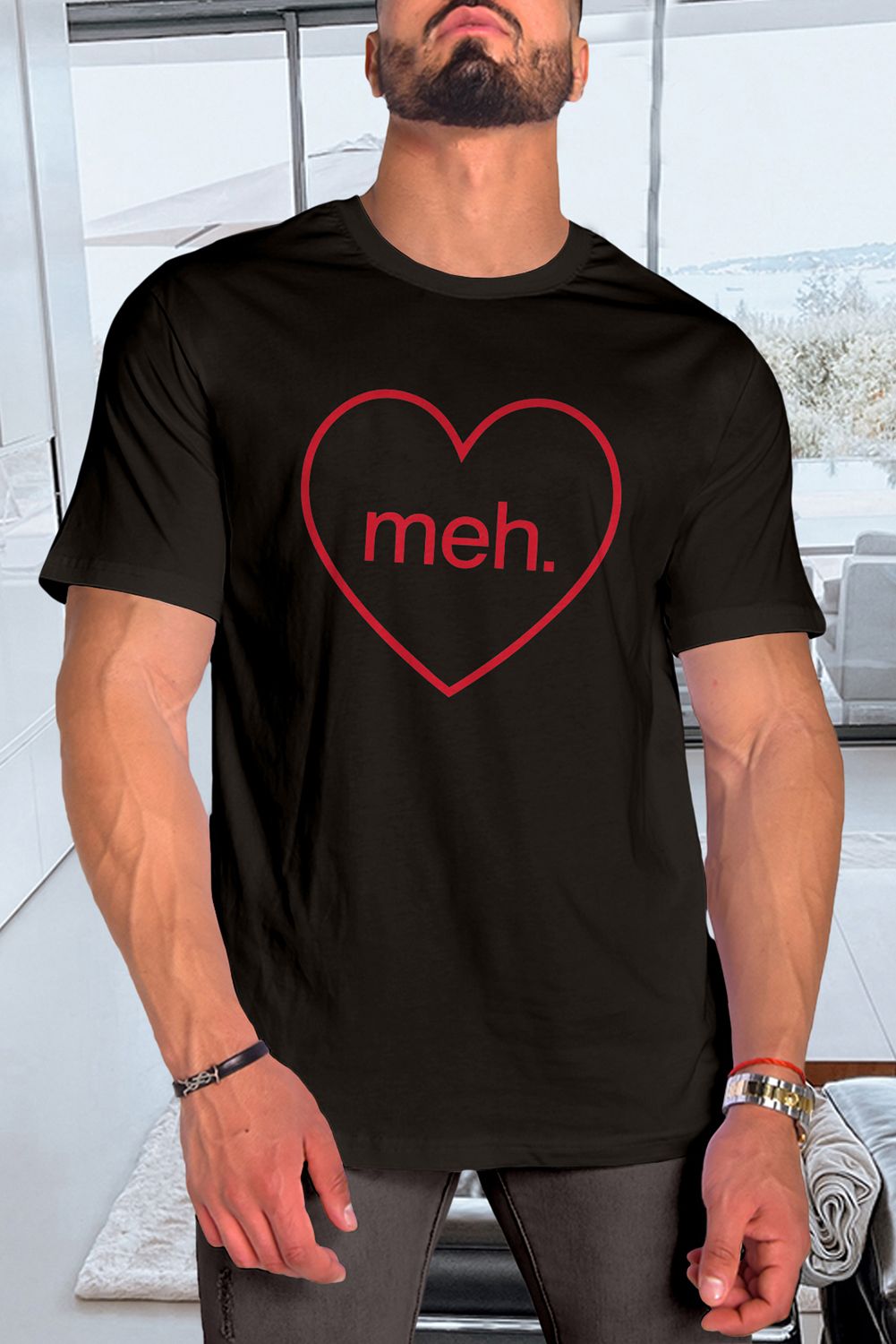 Black meh. Heart Shaped Print Crewneck Short Sleeve Men's Tee
