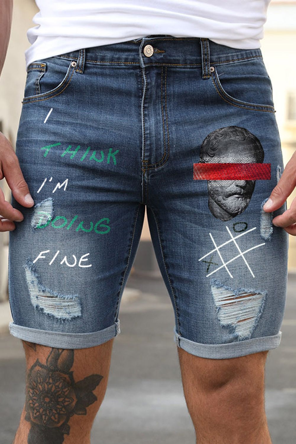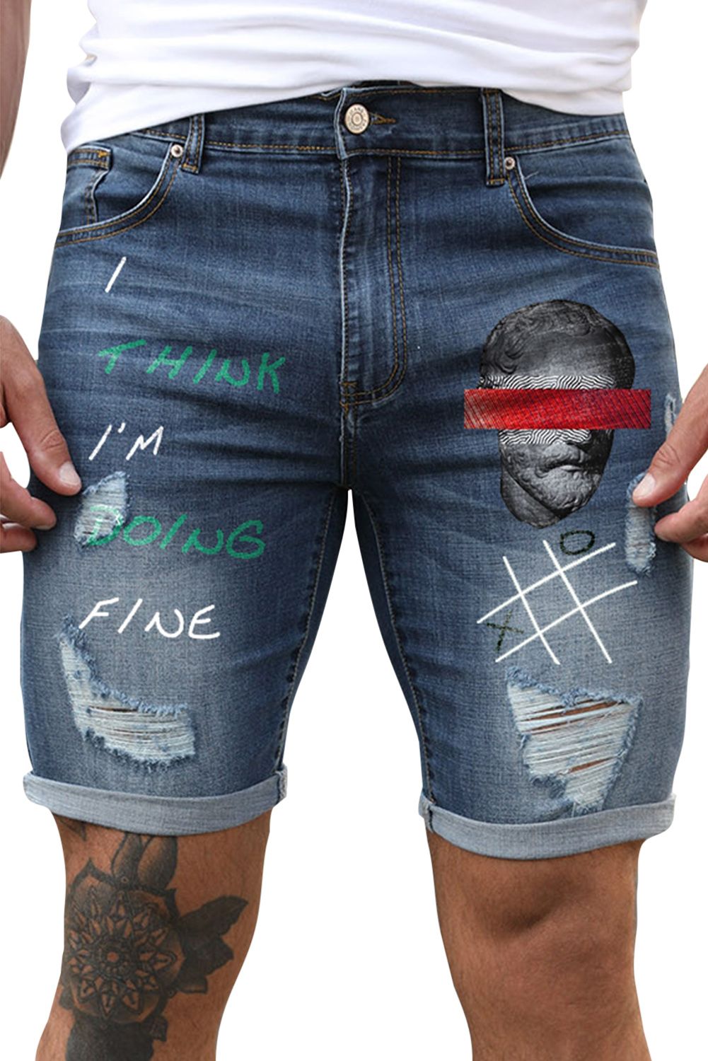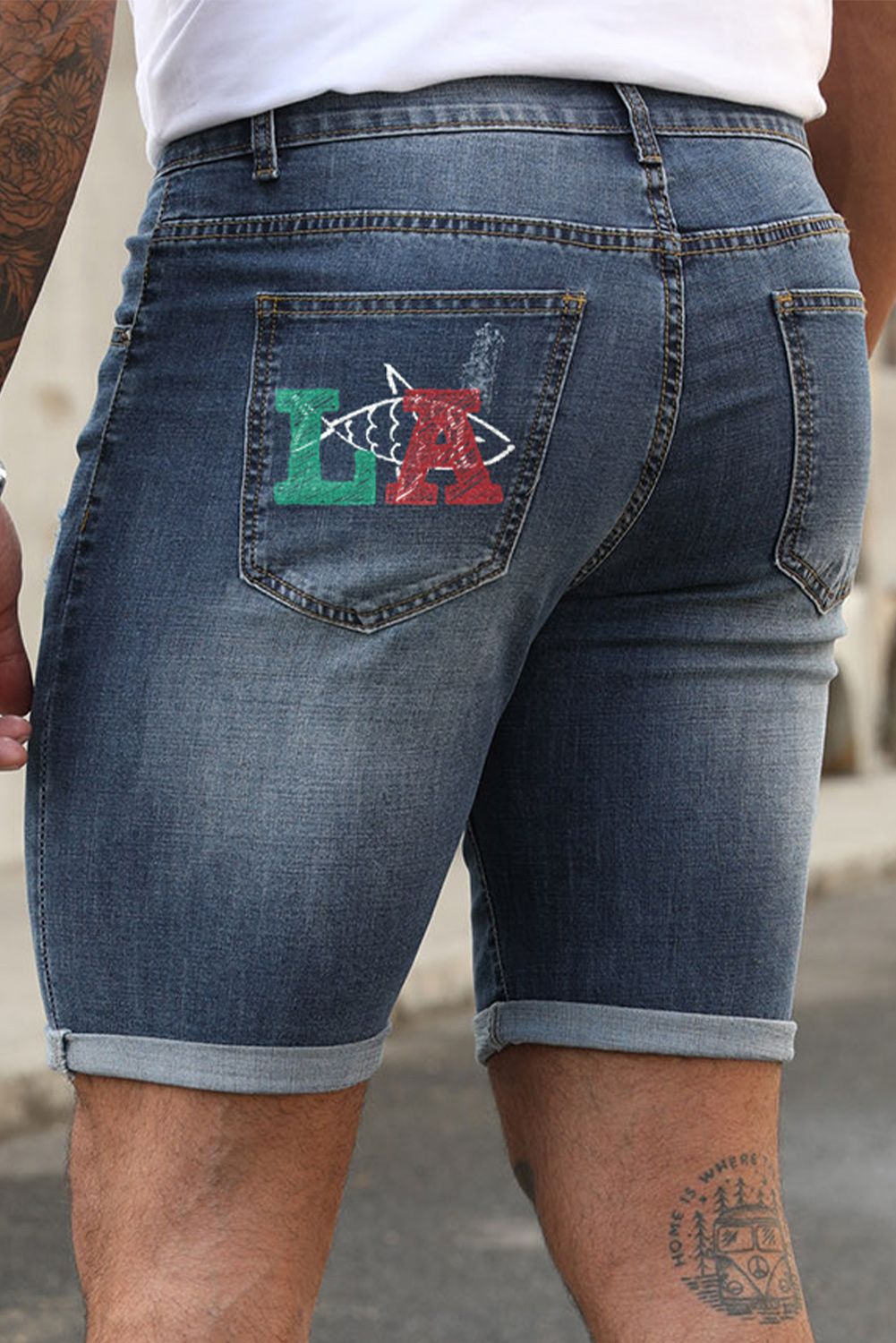 Blue Figure Letter Printed Skinny Fit Men's Denim Shorts