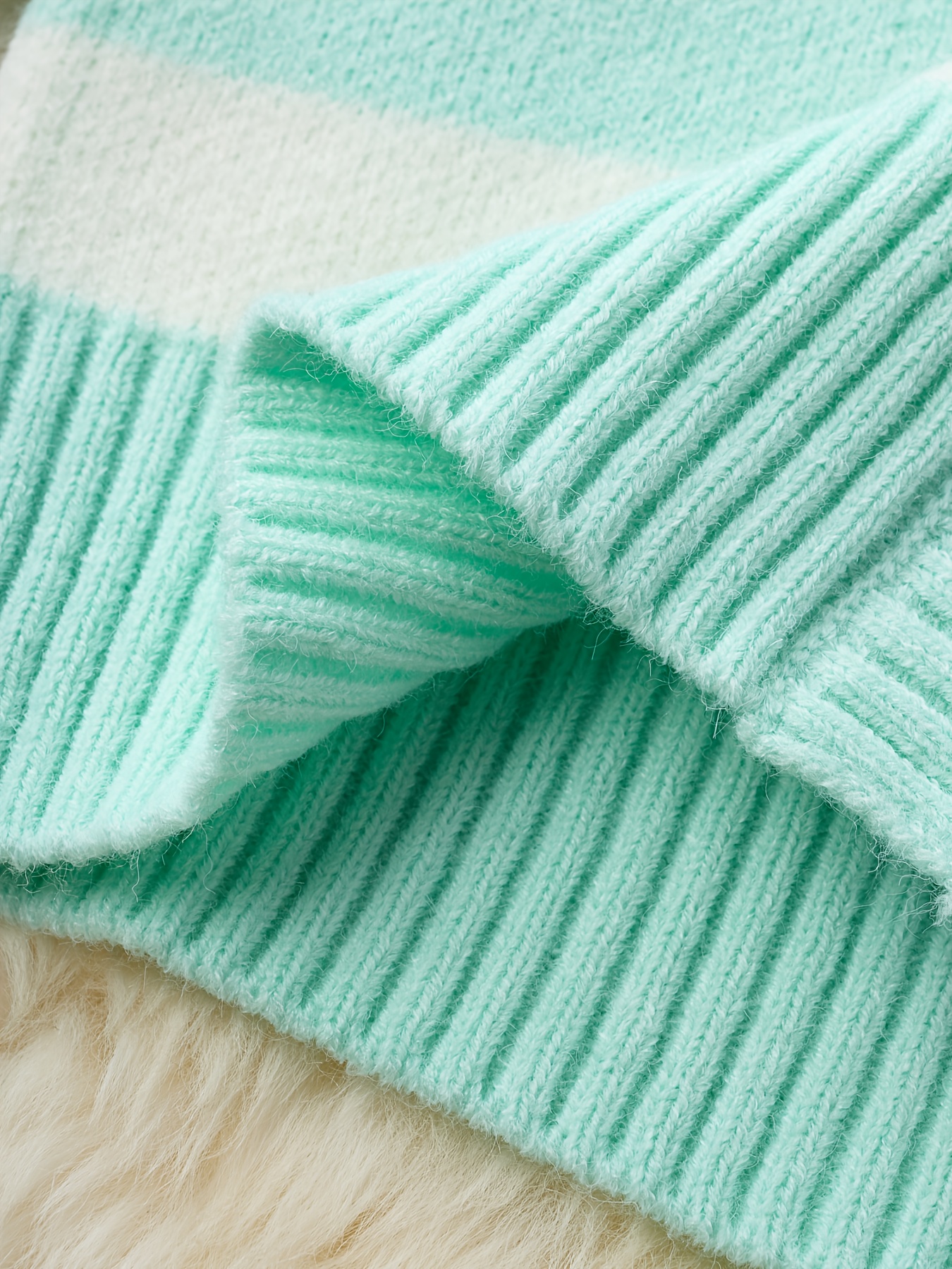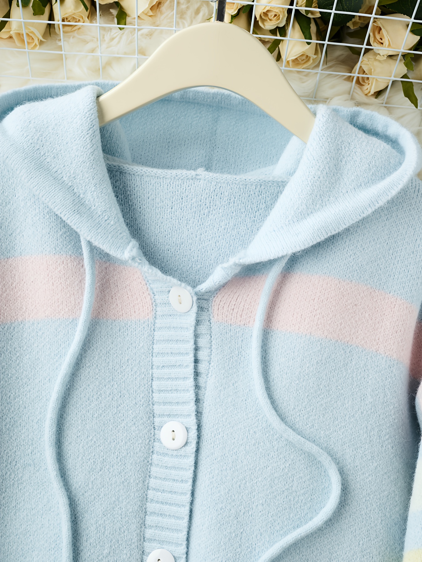 [Cute Sweater] Cozy White Hooded Cardigan Sweater | Women's Casual Pullover with Pastel Rainbow Stripes, Button Front Placket & Pom-Pom Detail, Medium Elasticity, Relaxed Fit, Comfortable Texture, Stylish, Fall Winter Layering Piece