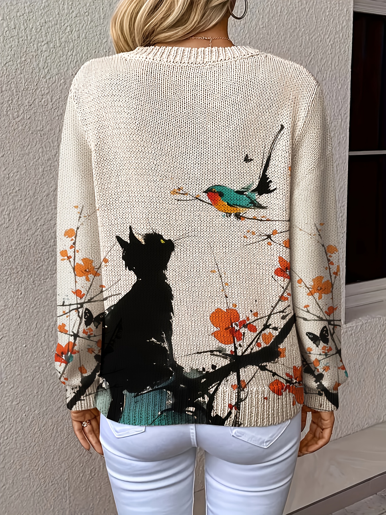 [Lightweight|Vneck Sweater] Lightweight|Vneck Sweater | Women's Elegant V-Neck Sweater with Colorful Cat & Floral Print - Long Sleeve, Button-Up Front, Perfect for Fall/Winter Commute & Casual Outings, Autumn Winter Apparel | Construction, Cat Sweater