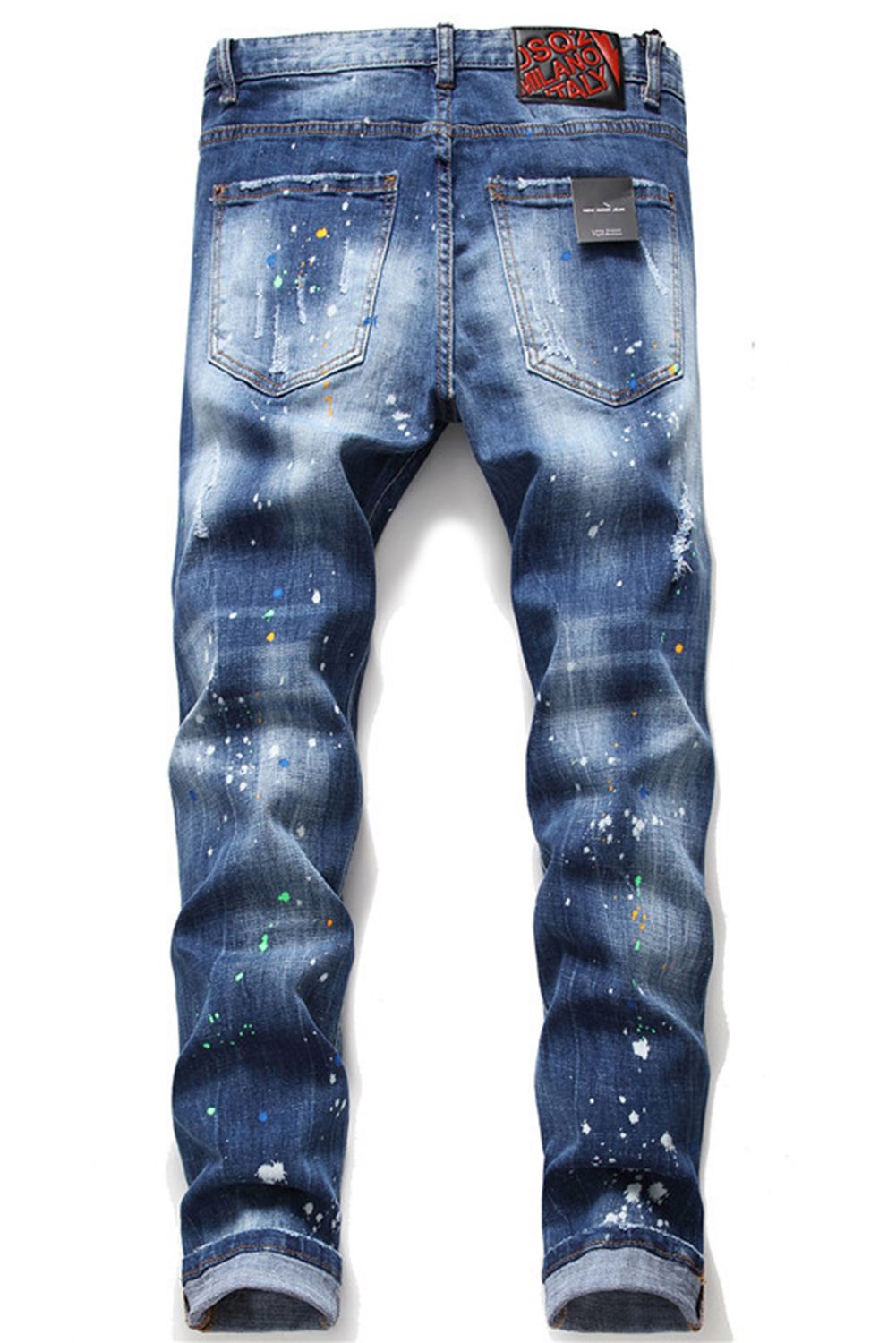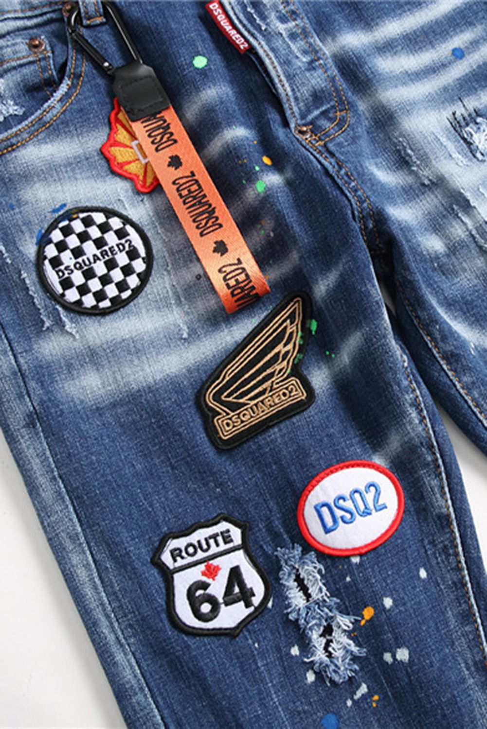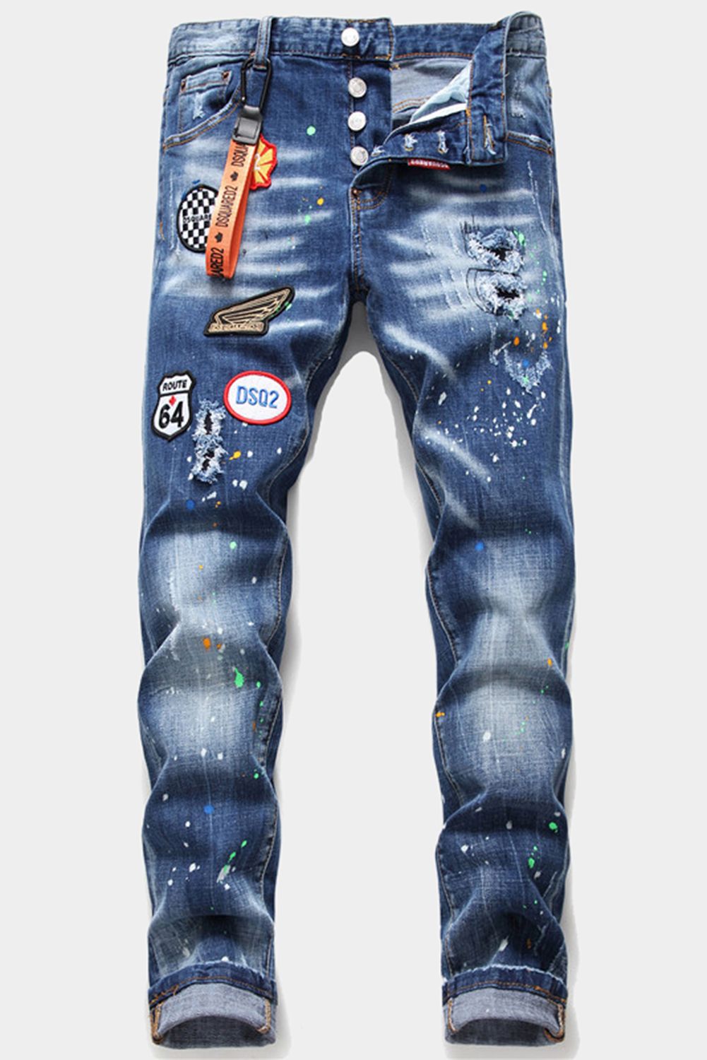 Men's Badge Pattern Patchwork Paint Splash Slim-fit Jeans