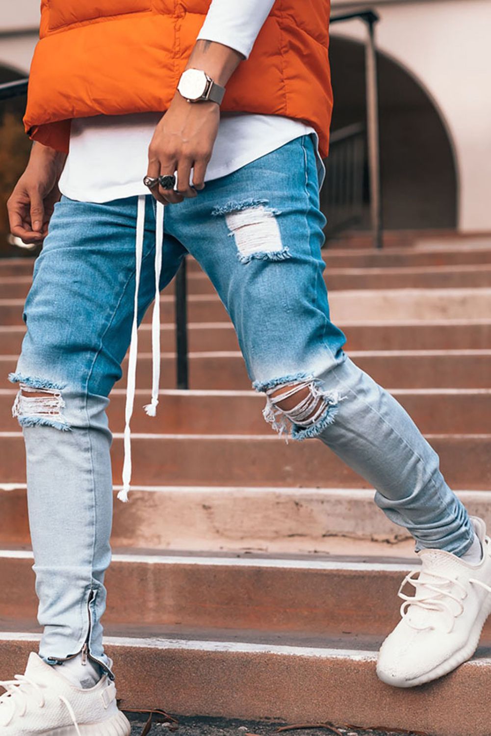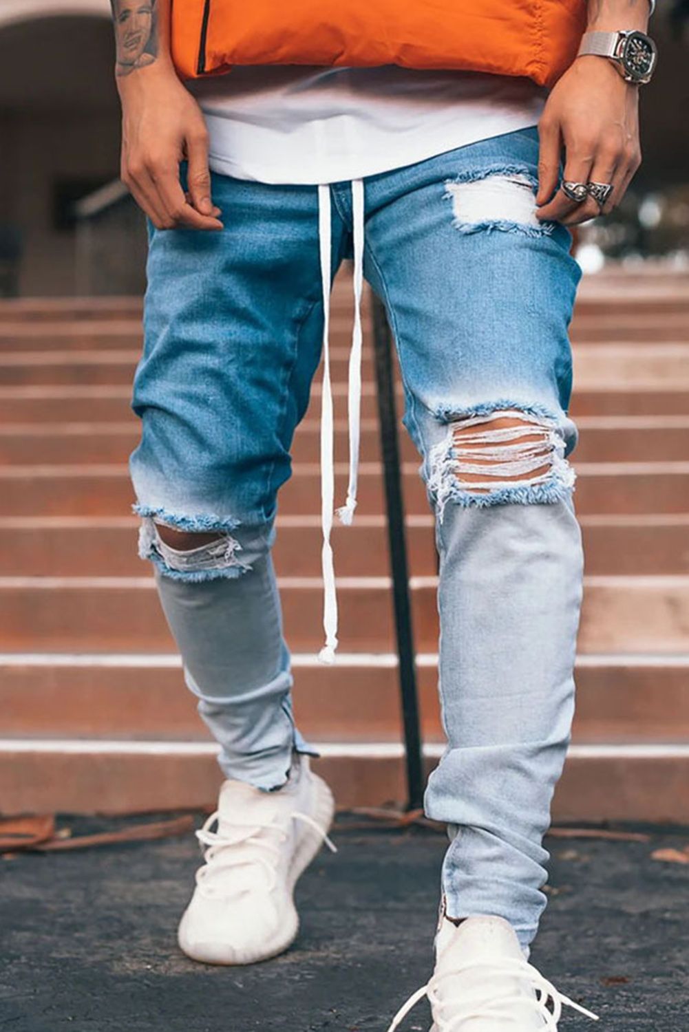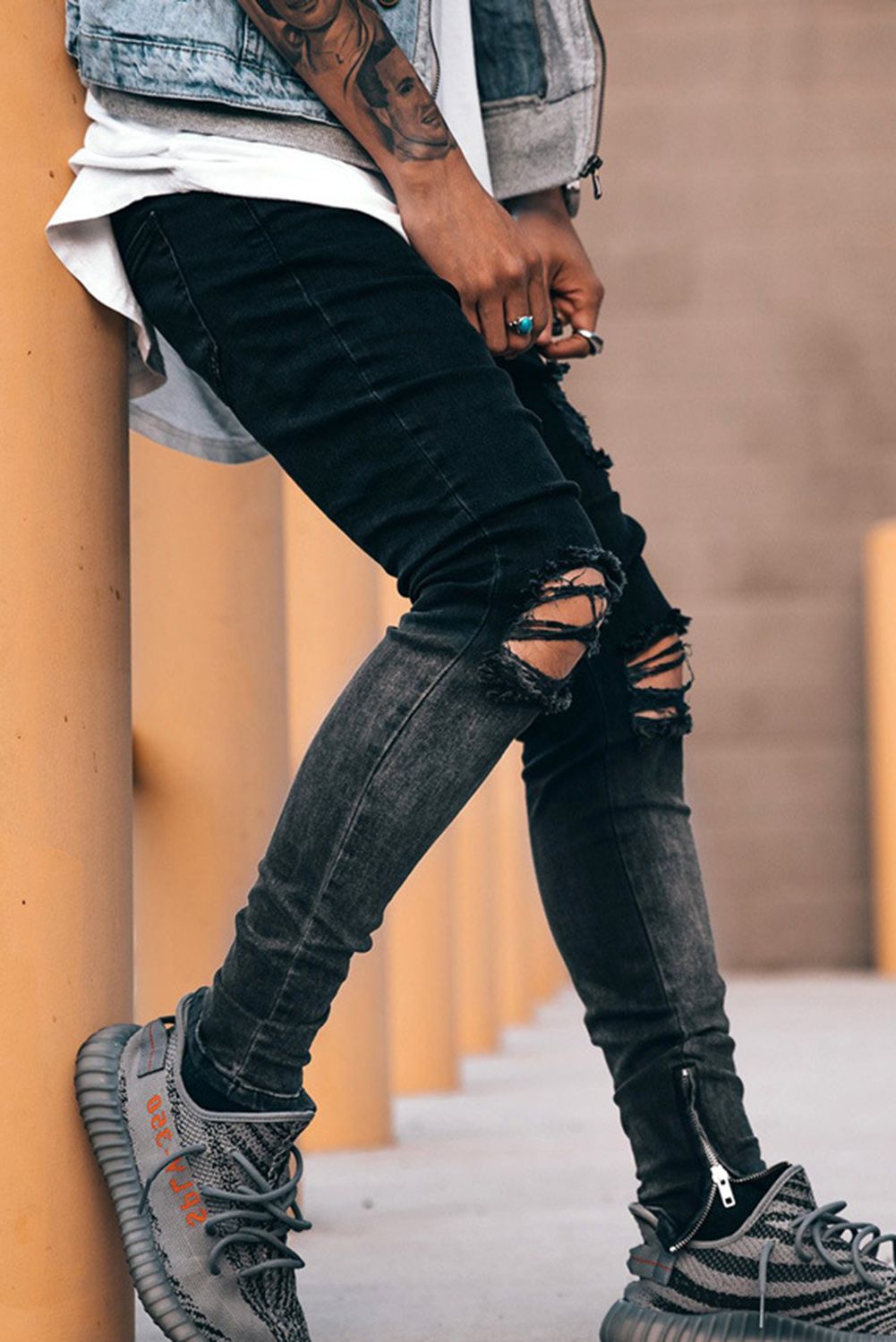 Black Gradient Color Zip-up Distressed Slim-fit Men's Jeans