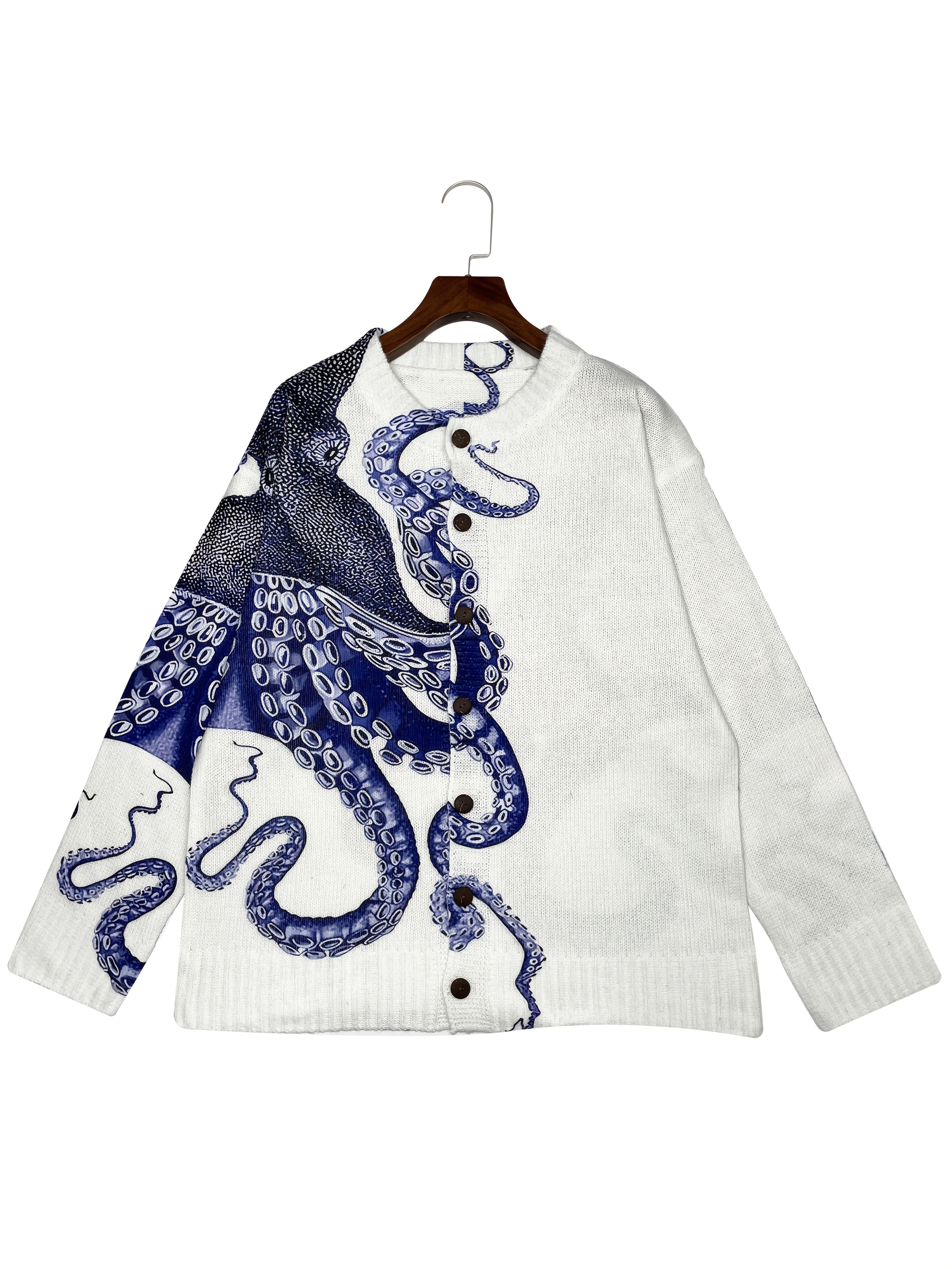 Women's 3D Printed Octopus Cardigan - Fashion All-Over Blue & White Tentacle Design, Button Front Round Neck Sweater for All-Season Wear, Casual Wear, Stylish Outerwear, Bold Pattern, Textured, Comfortable Fit