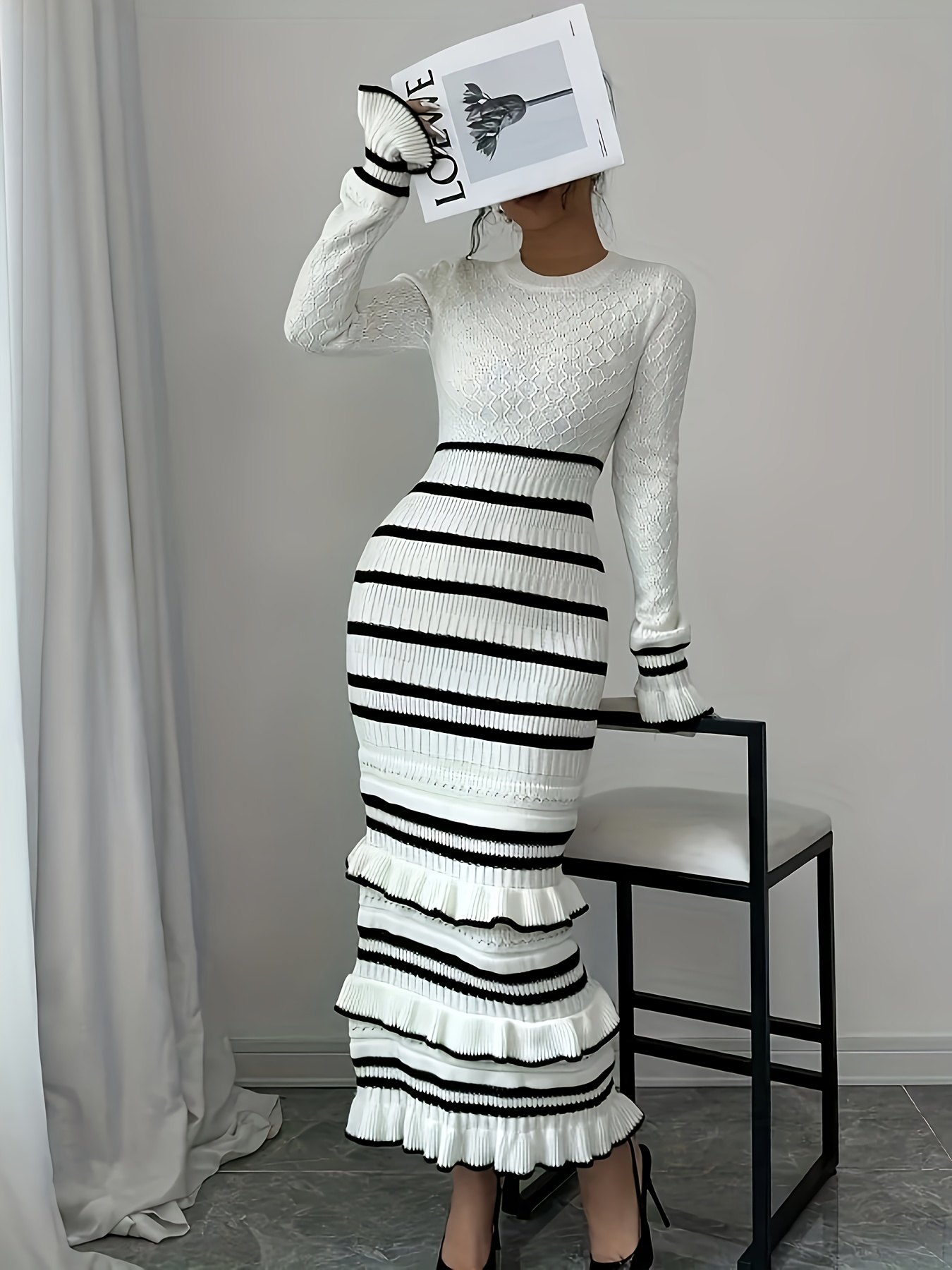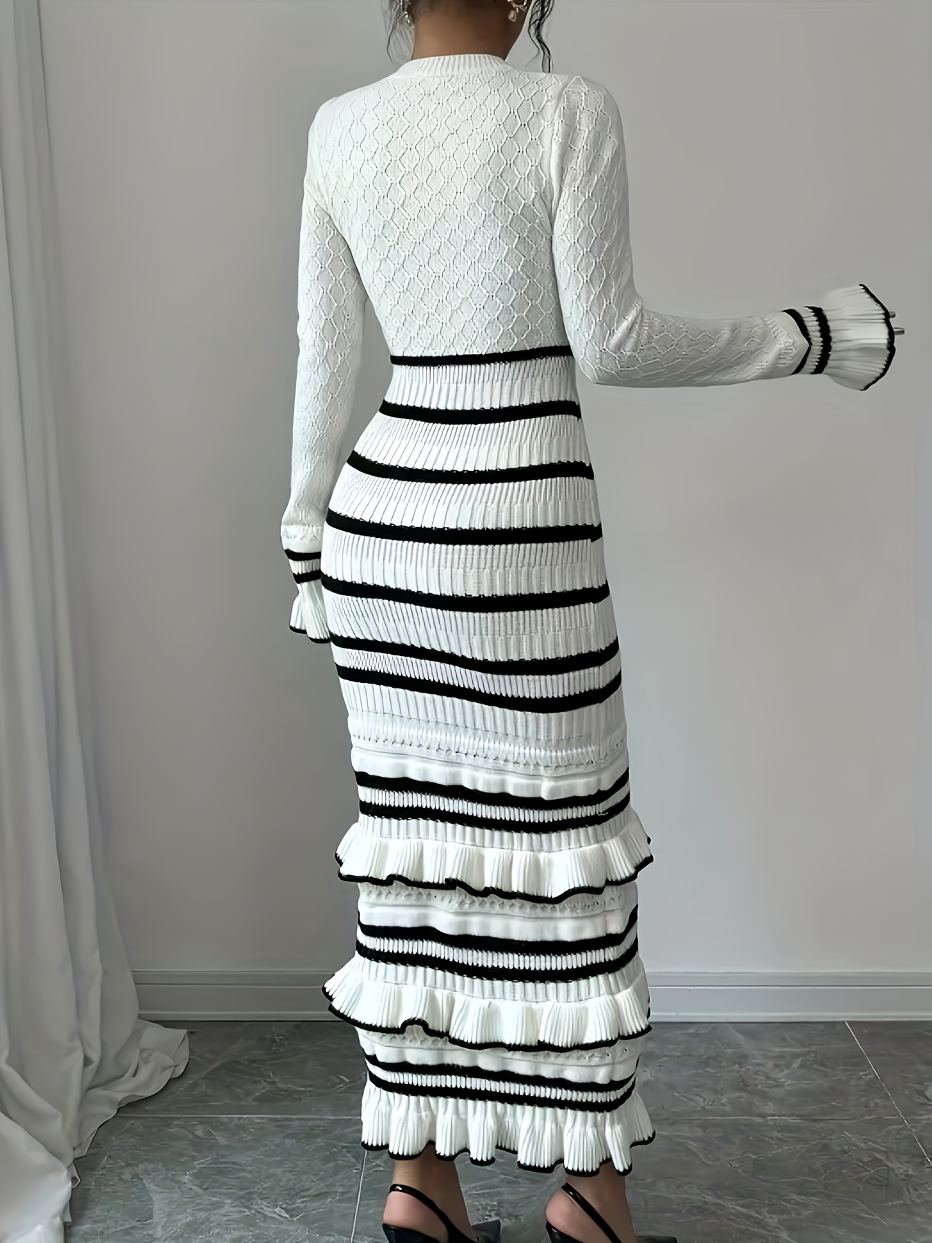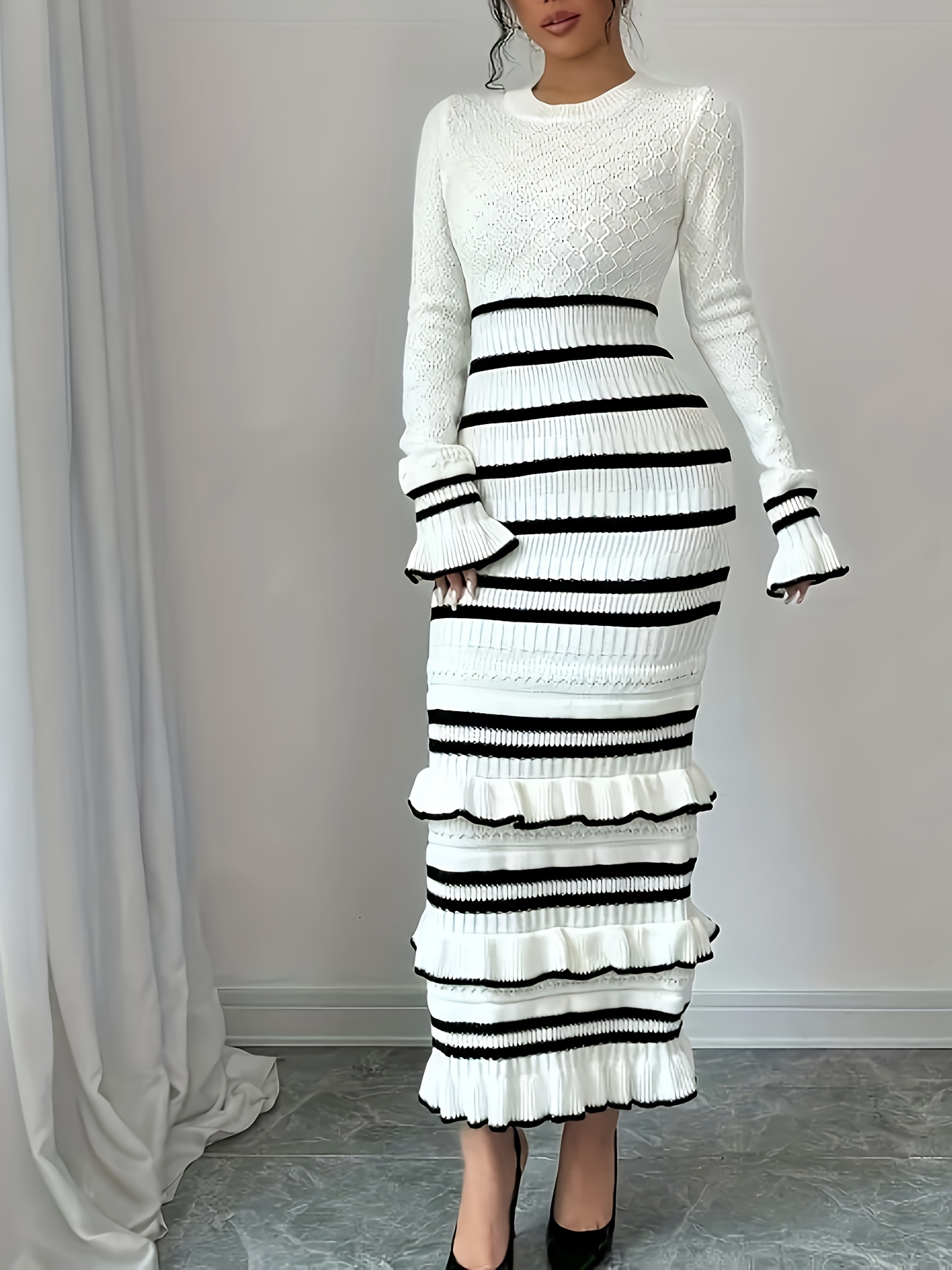 Warning: filesize(): stat failed for /www/wwwroot/www.vivadressstore.com/storage/cache/cache.may_advanced_option_product_.1768455672 in /www/wwwroot/www.vivadressstore.com/storage/modification/system/library/cache/file.php on line 32Warning: fread(): Length parameter must be greater than 0 in /www/wwwroot/www.vivadressstore.com/storage/modification/system/library/cache/file.php on line 32 Women's Elegant Striped Dress - Slim Fit Waist-Cinching Bodycon with Ruffled Hem, Black & White Horizontal Stripes, Round Neck Long Sleeve Fall Winter Fashion, Dress - from category Women's Sweaters (Your Store)