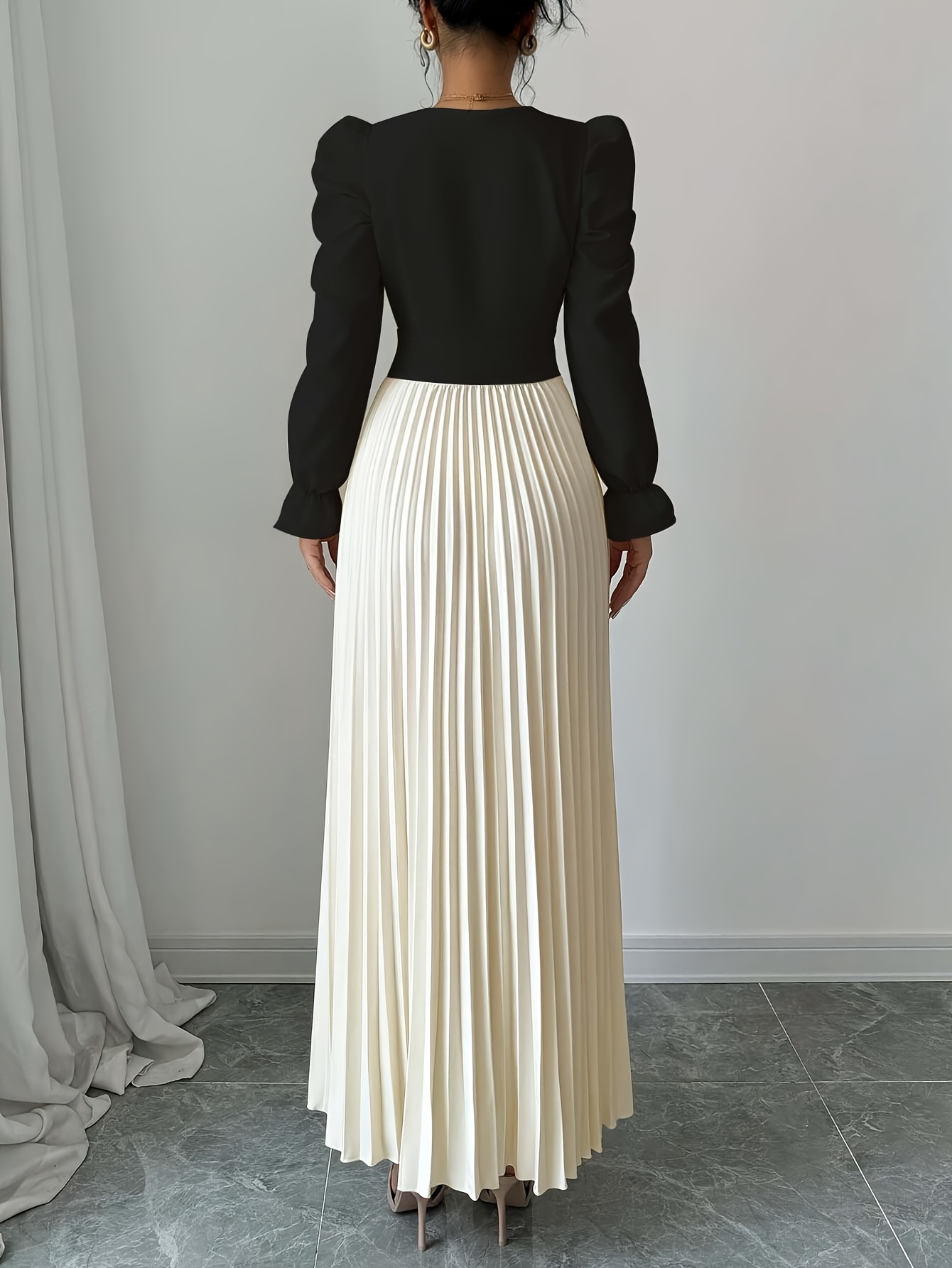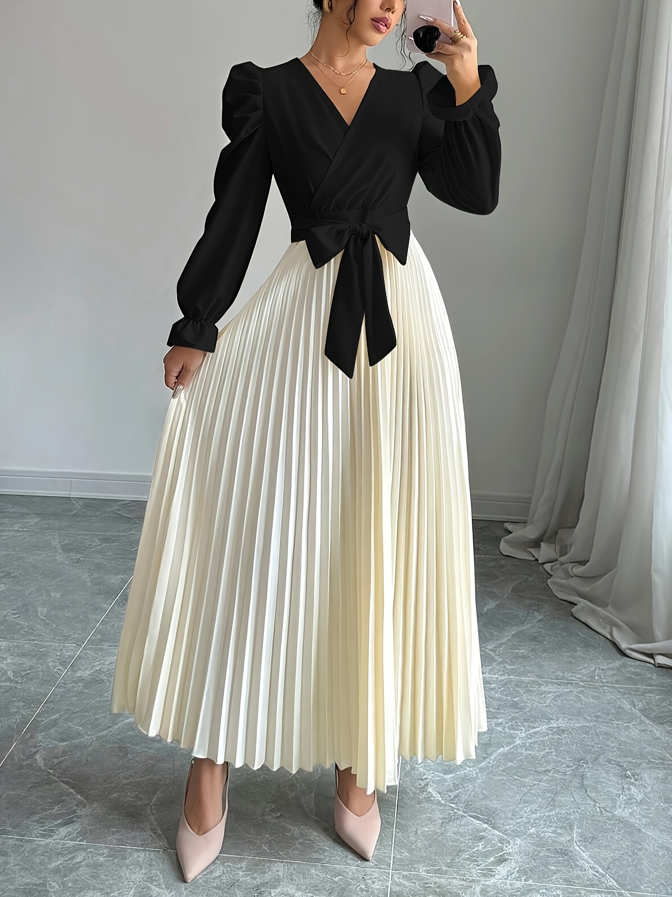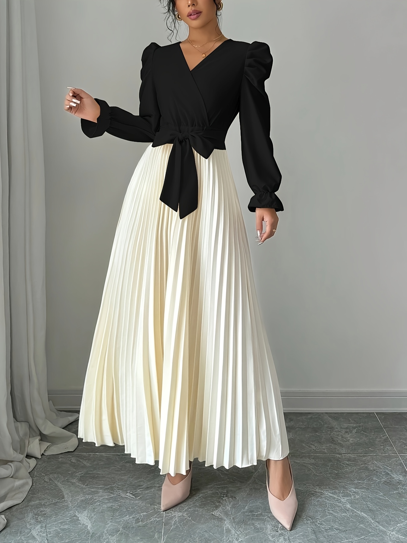 Women's Elegant V-Neck Long Sleeve A-Line Dress with Waist Tie Belt - Pleated Skirt, Machine Washable Solid Color, Spring/Summer Versatile Casual to Formal Wear, Spring Event Attire, Nontransparent Fabric, No Stretch Material
