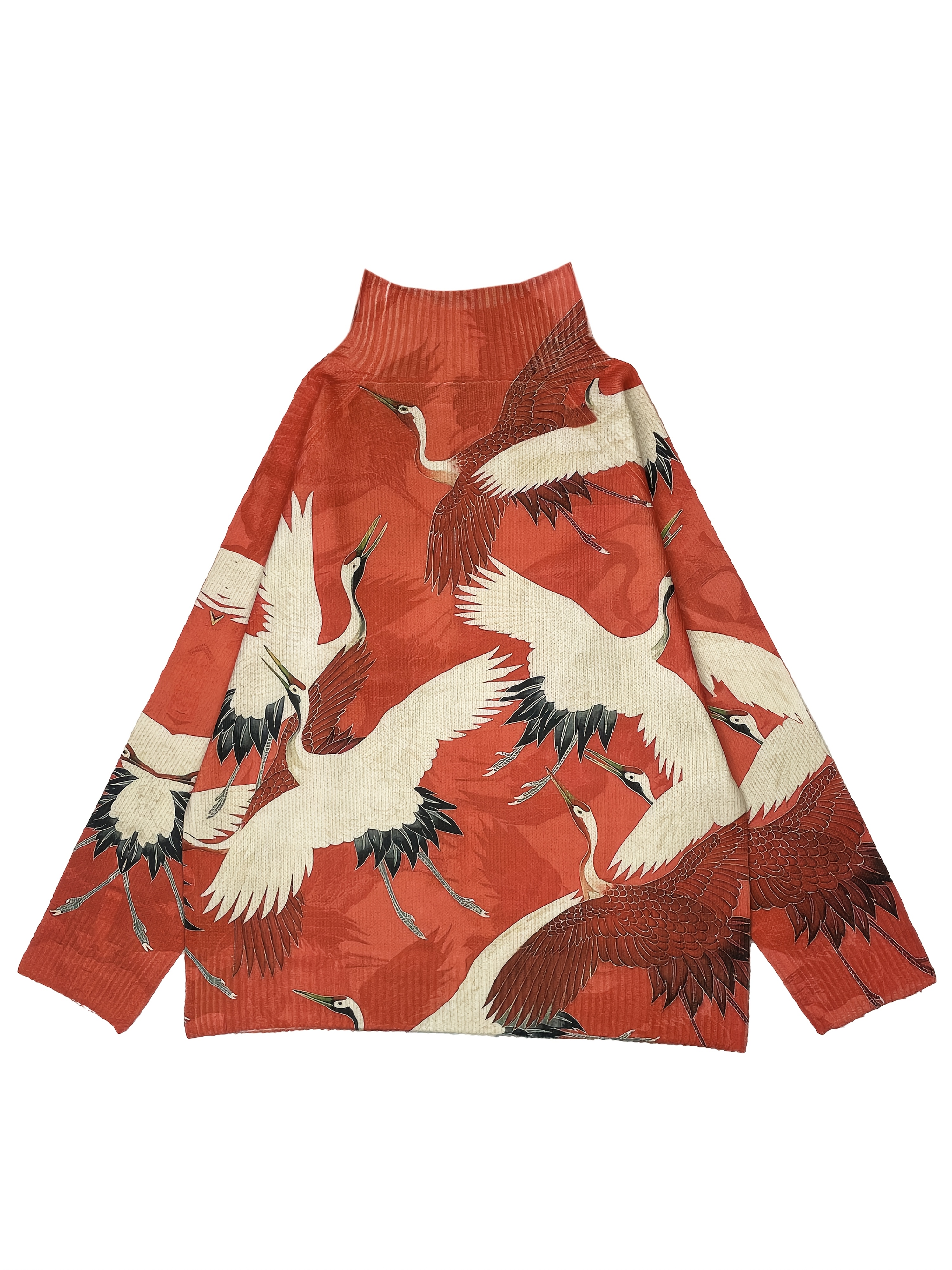 Women's Elegant Turtleneck Sweater - All-Over Crane Print in Red/Beige/Black/White, Soft Warm Pullover for All Seasons, Casual & Formal Wear, Turtleneck Sweater, Allseason Apparel, Highneck Design, Textured Knitwear, Quality Craftsmanship