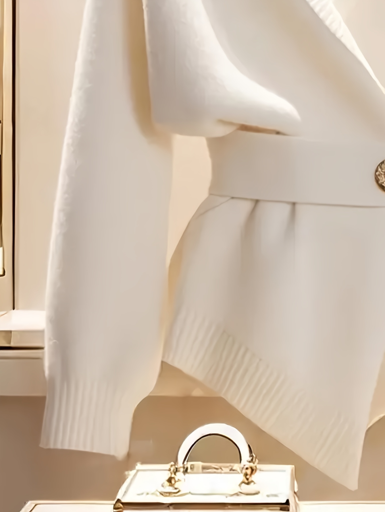 Warning: fread(): Length parameter must be greater than 0 in /www/wwwroot/www.vivadressstore.com/storage/modification/system/library/cache/file.php on line 32 Women's White V-Neck Adjustable Belted Cardigan with Golden Buckle Detail - Soft Long Sleeve Elegant Casual Layering Pullover for Spring and Autumn, Fashionable Weekend Wear - from category Women's Sweaters (Your Store)