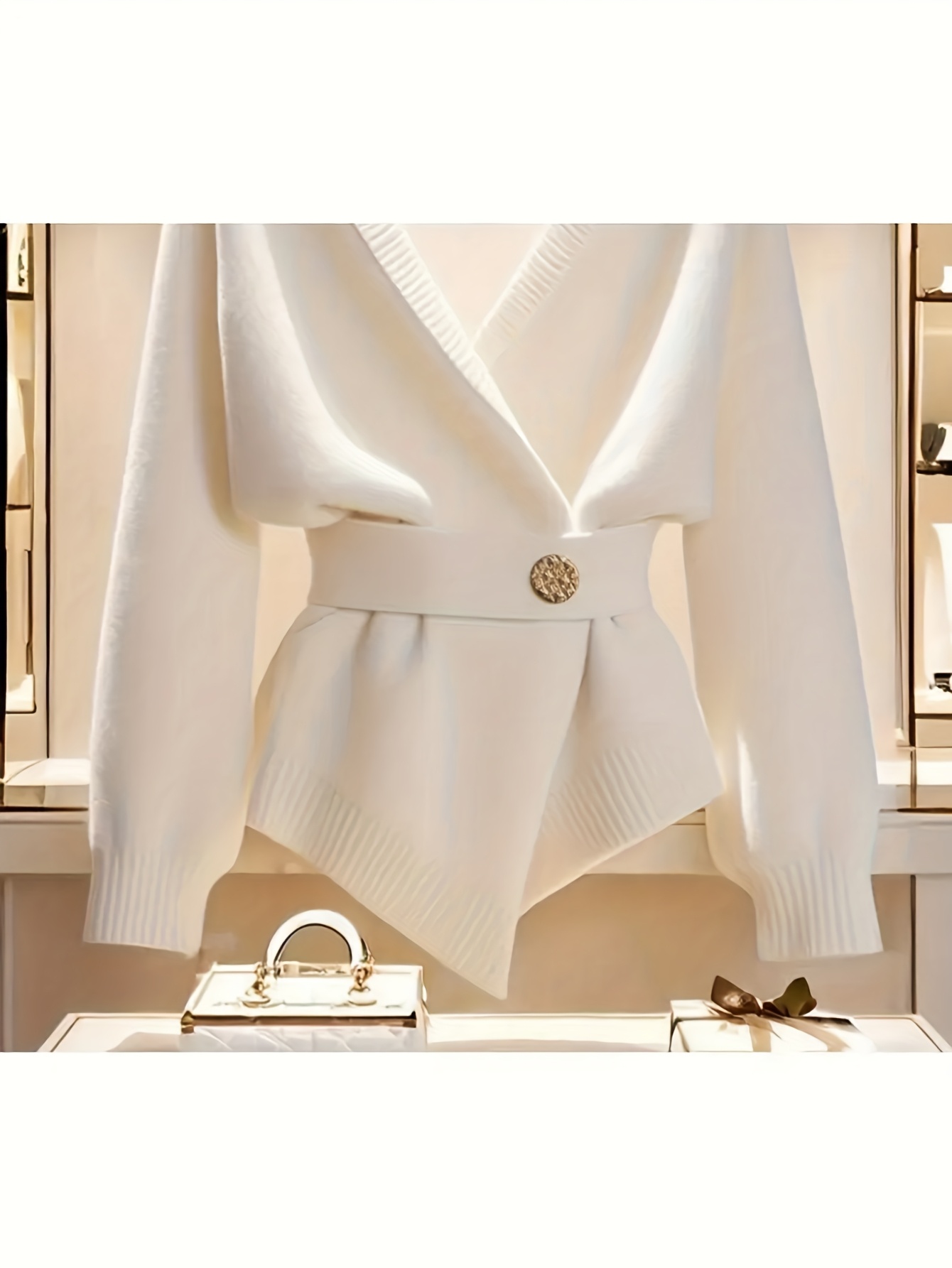 Women's White V-Neck Adjustable Belted Cardigan with Golden Buckle Detail - Soft Long Sleeve Elegant Casual Layering Pullover for Spring and Autumn, Fashionable Weekend Wear