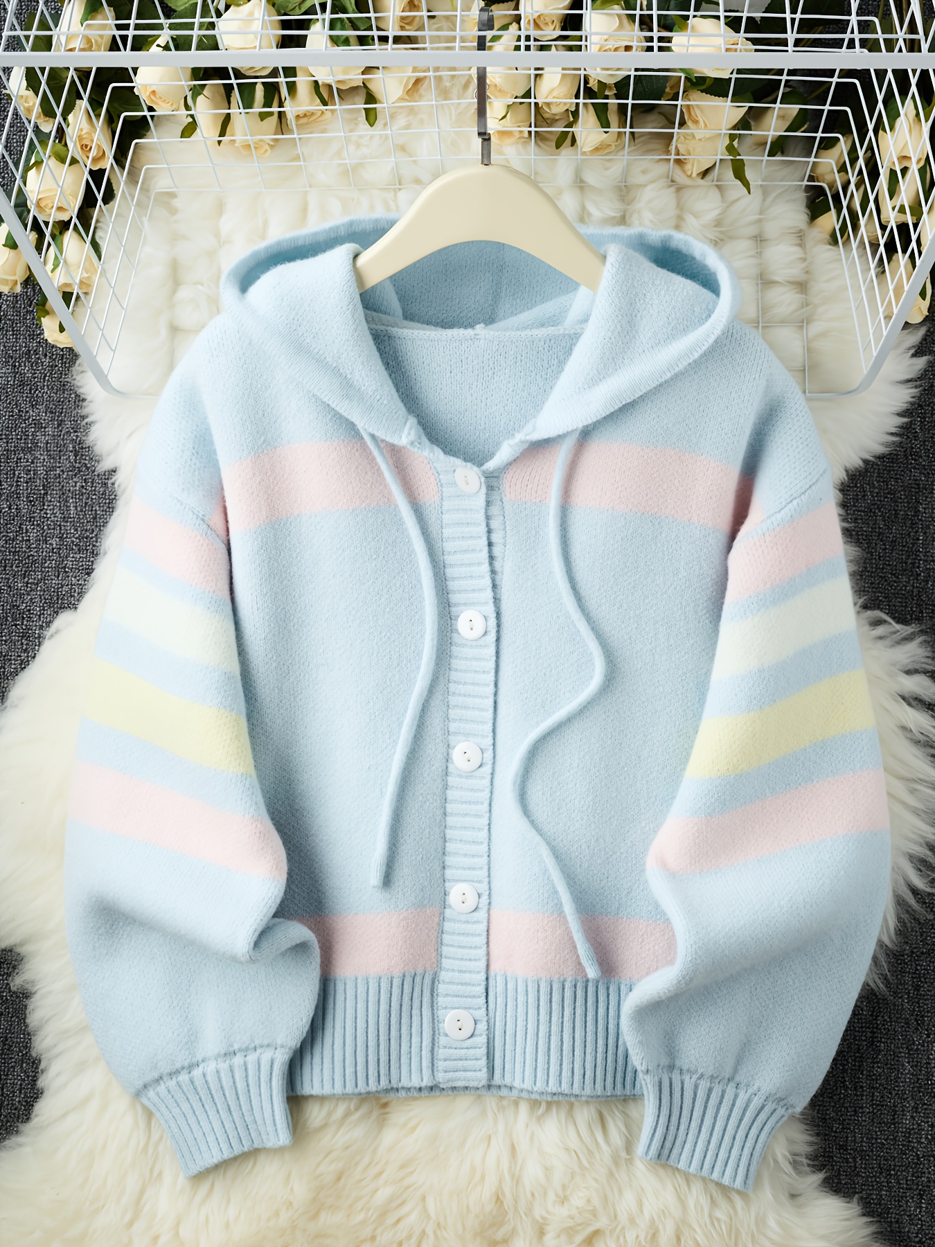 [Cute Sweater] Cozy White Hooded Cardigan Sweater | Women's Casual Pullover with Pastel Rainbow Stripes, Button Front Placket & Pom-Pom Detail, Medium Elasticity, Relaxed Fit, Comfortable Texture, Stylish, Fall Winter Layering Piece