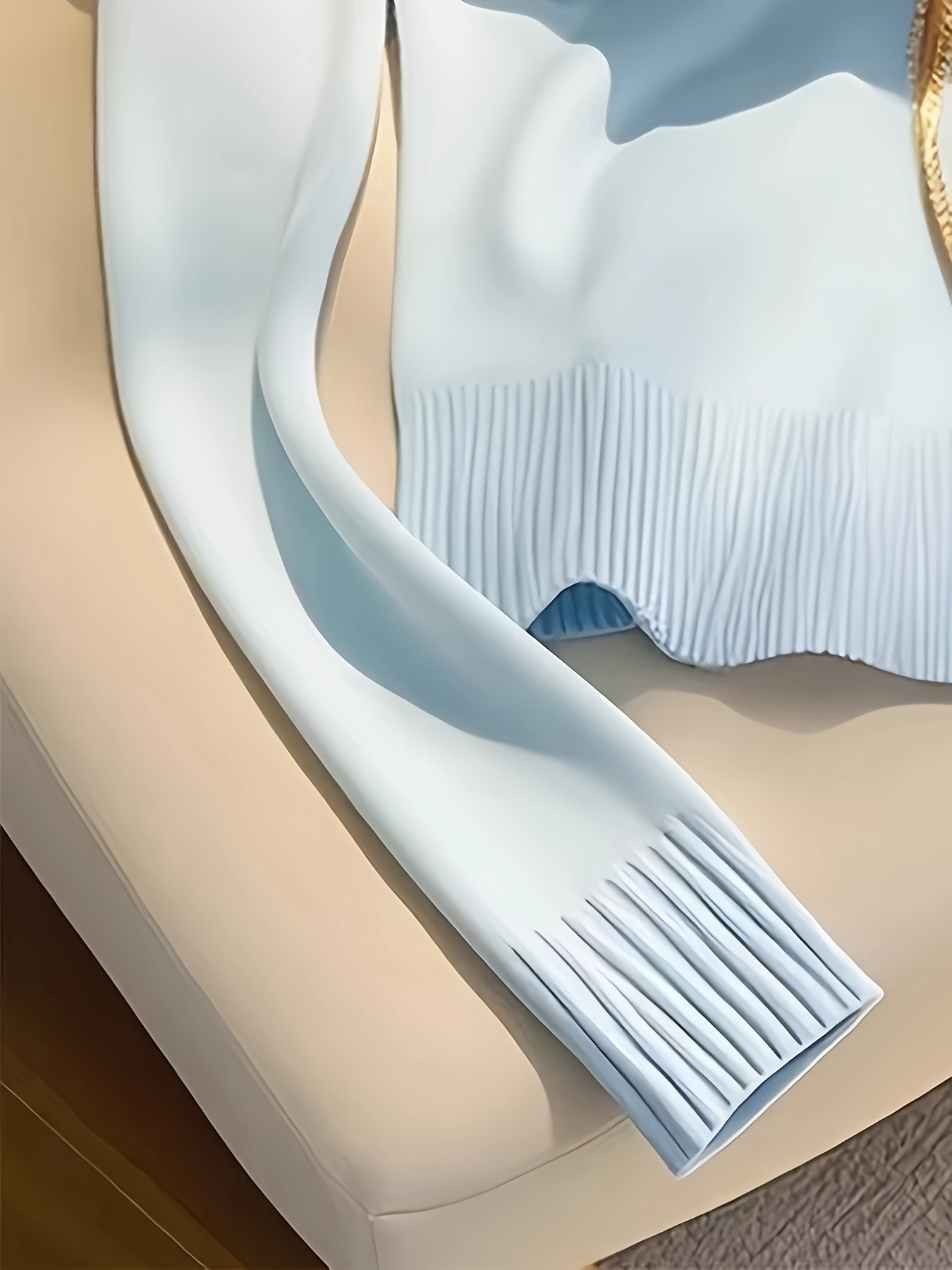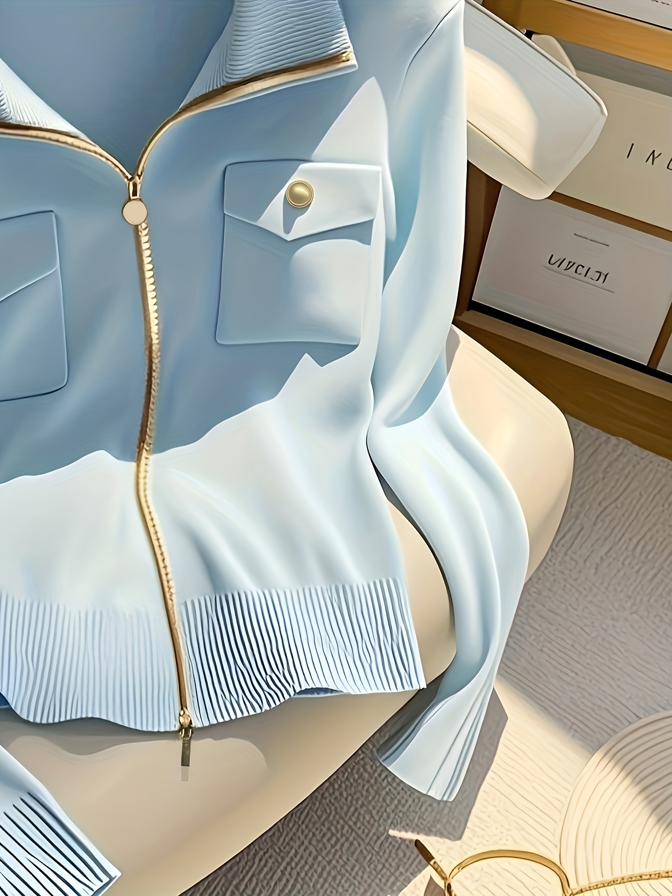 [Elegant Cardigan] Chic Elegant High-Neck Zip-Up Cardigan for Women | Long Sleeve Sweater with Chain Detail, Solid Blue, Perfect for Fall/Winter