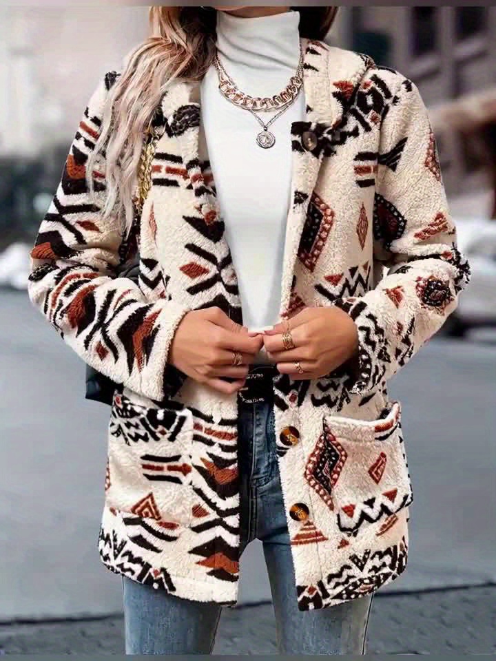 Women's Aztec Geometric Print Hooded Fleece Coat - Mid-Length Casual Winter Jacket with Front Pockets, Machine Washable & Single-Button Closure for Autumn/Winter Outings, Autumn Fashion, Ethnic Pattern Design, Durable Warmth