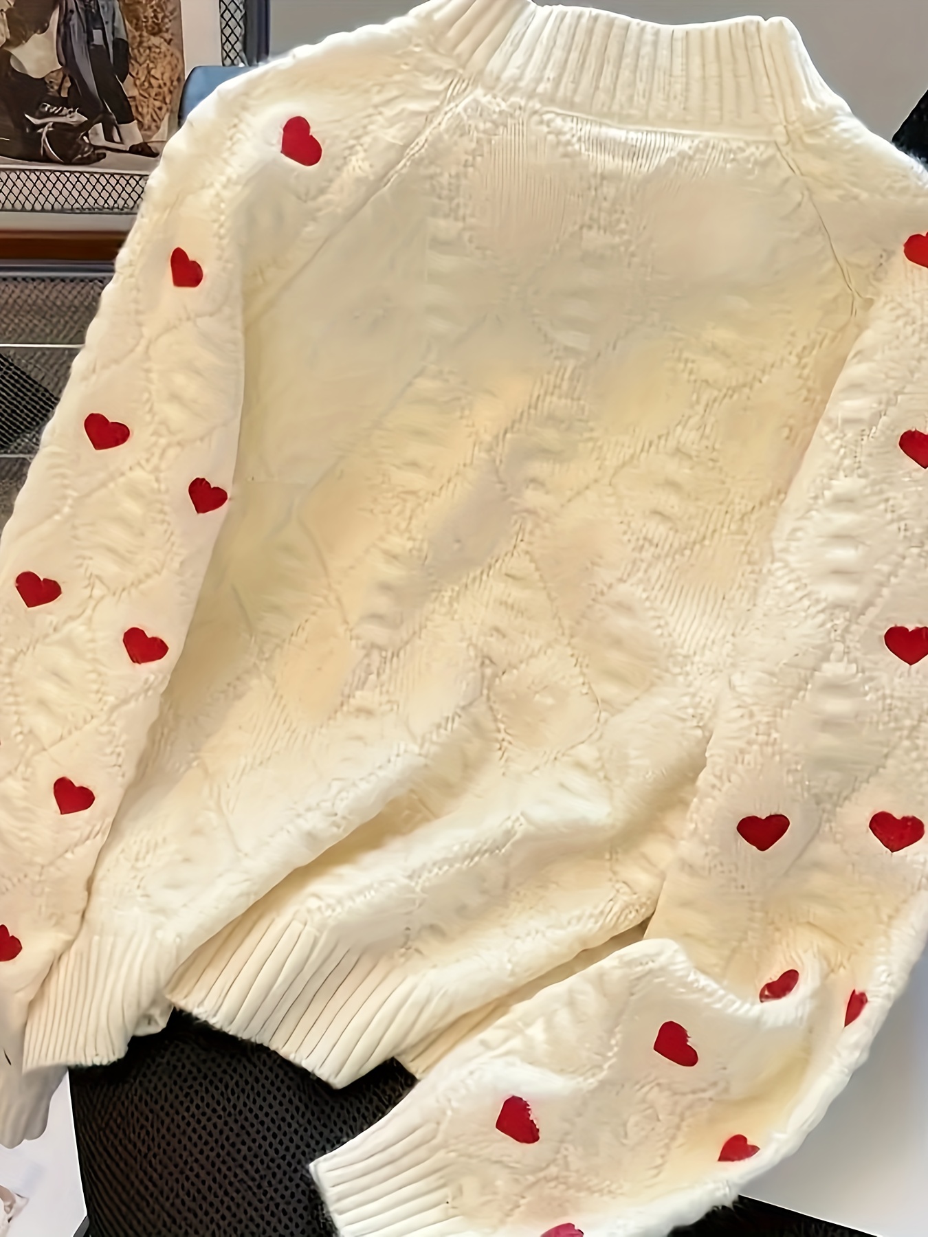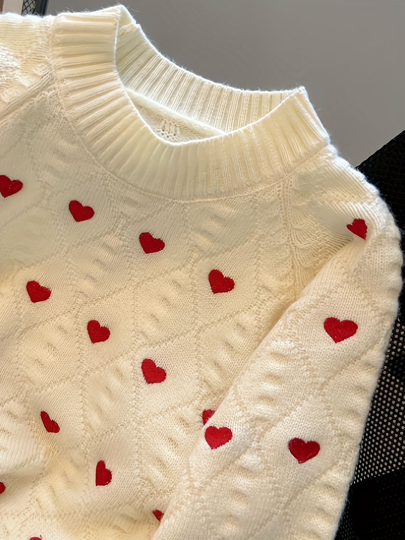 Women's Cozy Winter Sweater with Red Heart Patterns - Cute Round Neck Pullover, Soft Warm for Fall & Winter, Casual Chic Outfits, Cute Sweater, Comfortable Outfit, Details