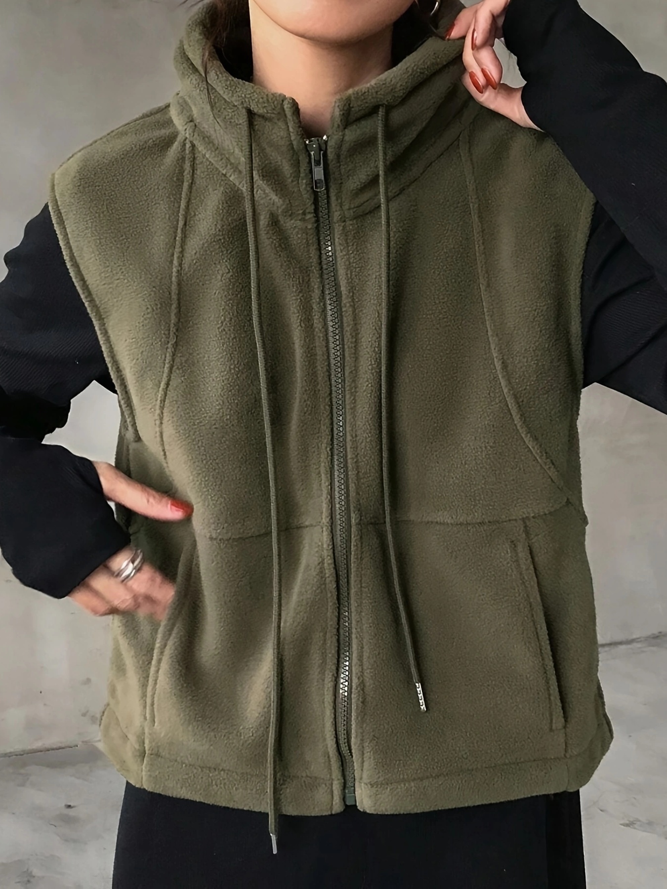 Women's Elegant High-Neck Sleeveless Zipper Jacket - Solid Color Olive Green Winter Coat, Full-Zip Closure, Structured Non-Stretch Design for Fall & Winter, Versatile Outerwear for Casual & Formal Occasions