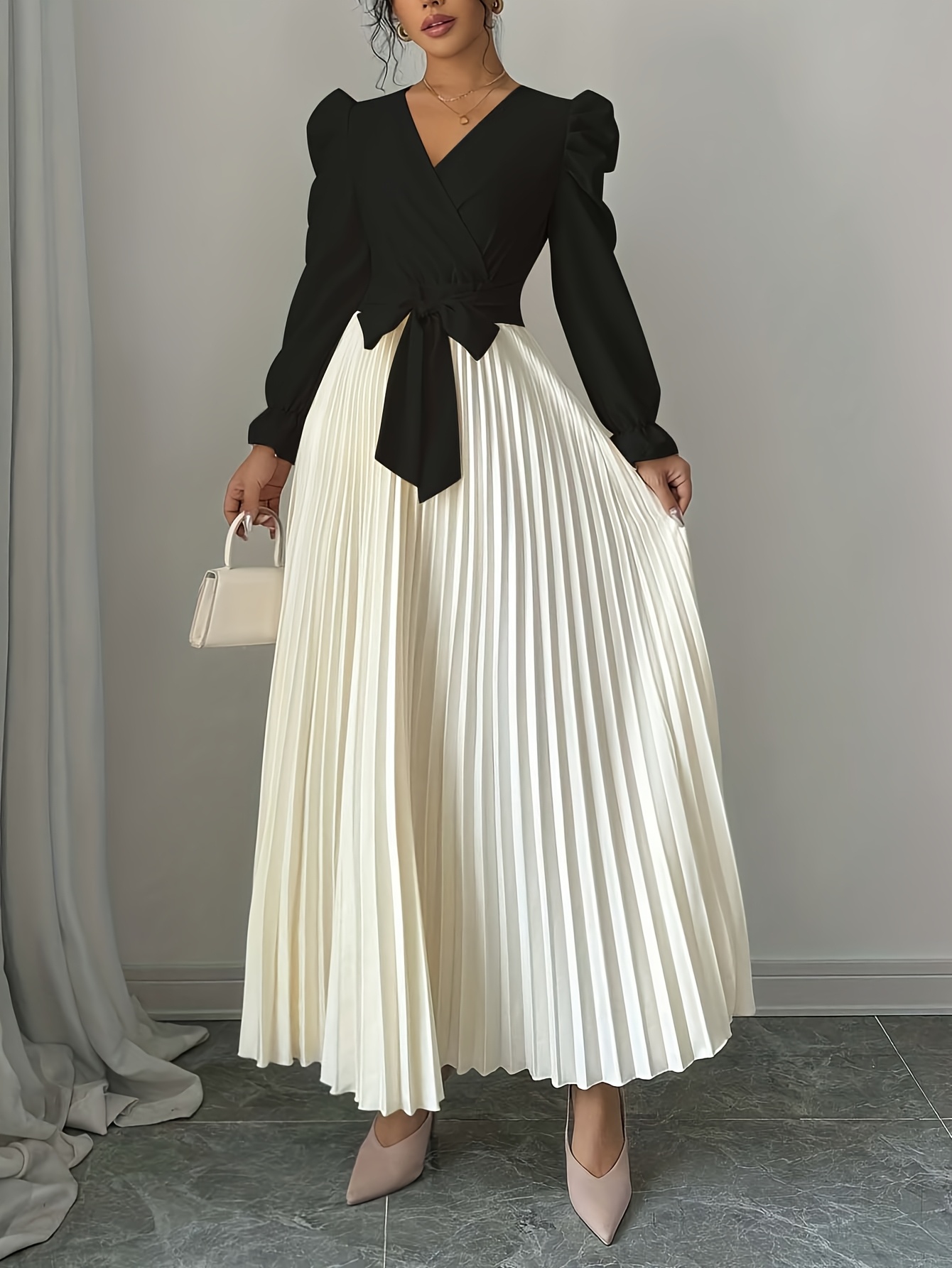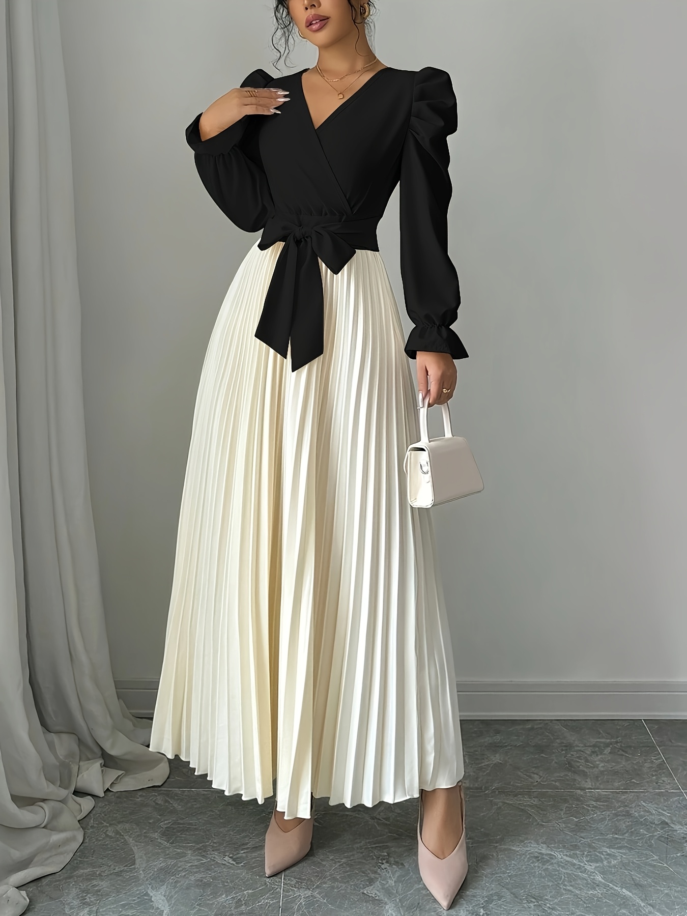 Women's Elegant V-Neck Long Sleeve A-Line Dress with Waist Tie Belt - Pleated Skirt, Machine Washable Solid Color, Spring/Summer Versatile Casual to Formal Wear, Spring Event Attire, Nontransparent Fabric, No Stretch Material
