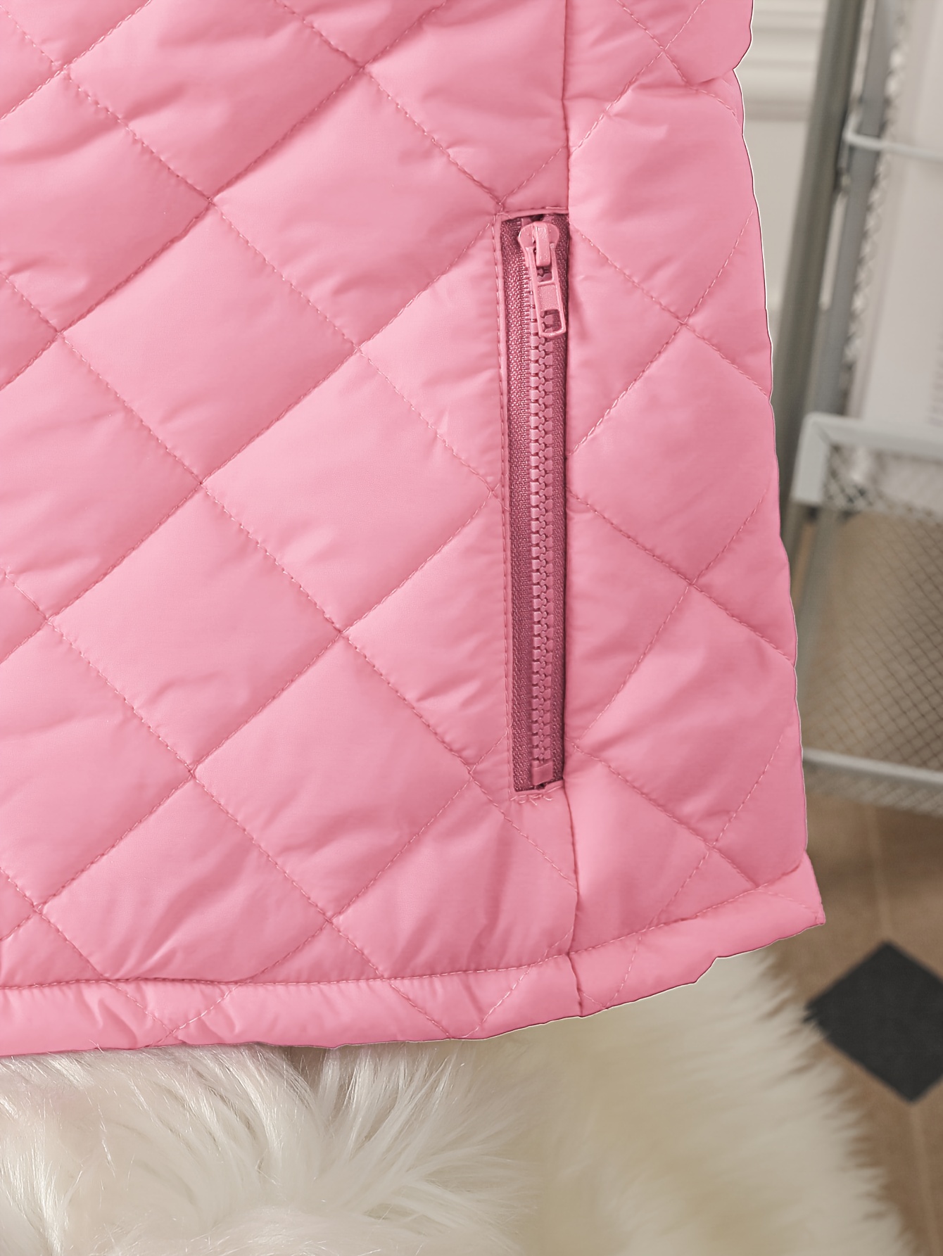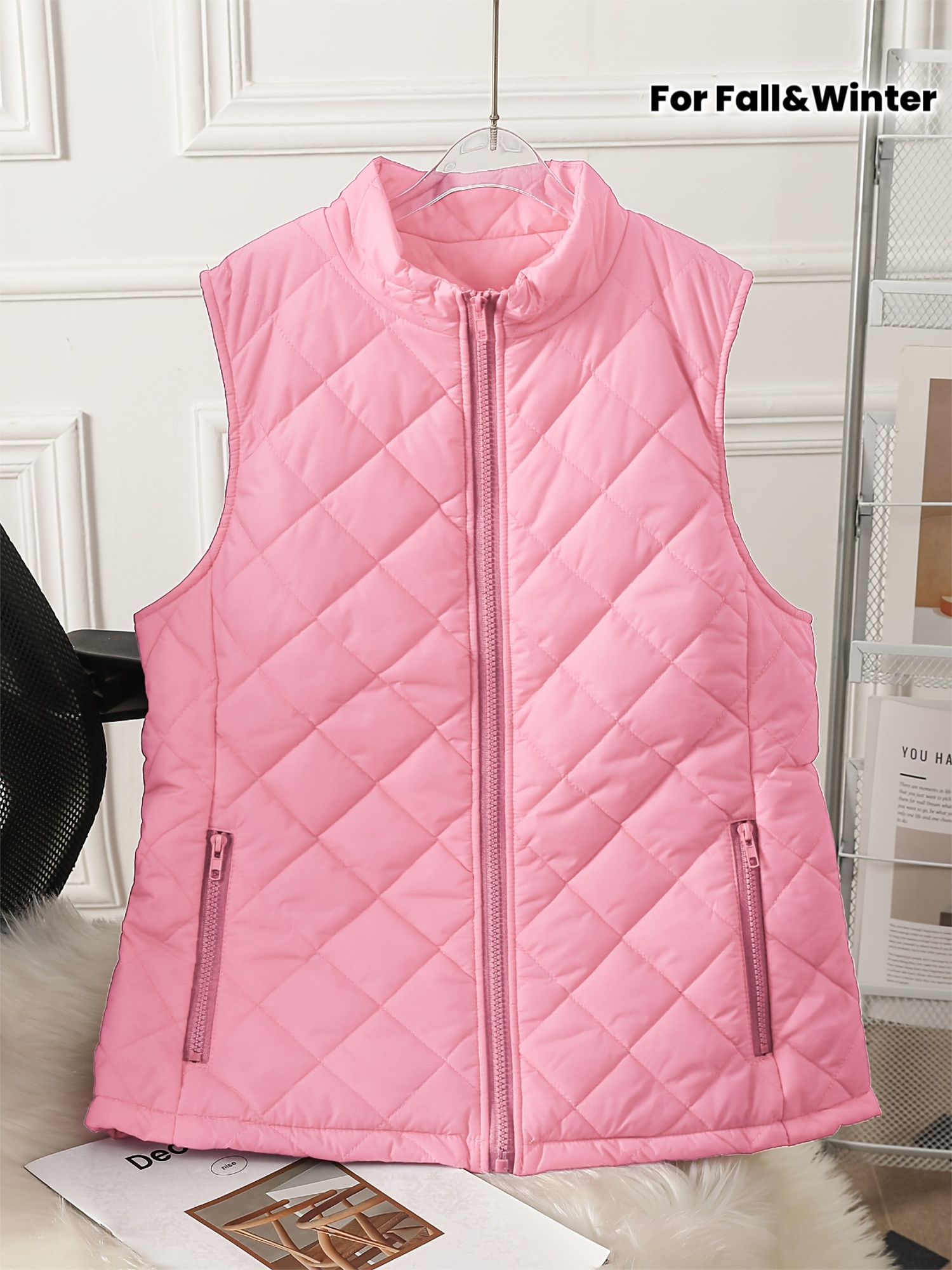 Women's Sleeveless Vest with Zipper Closure - Vibrant Pink Winter Warmth, Stand Collar & Pocket Design, Casual Elegant Solid Color Non-Stretch Fabric for Fall Winter Outdoor Beach Outings, Machine Washable Layering Piece (No Belt, Standard Length)