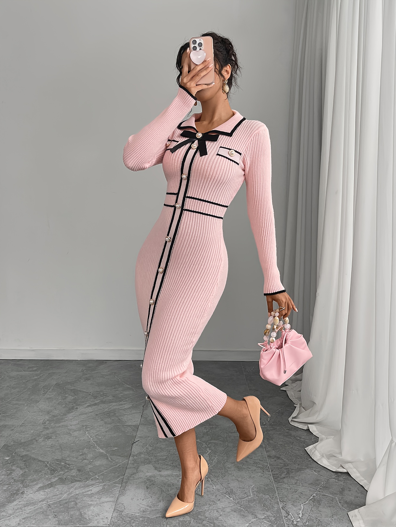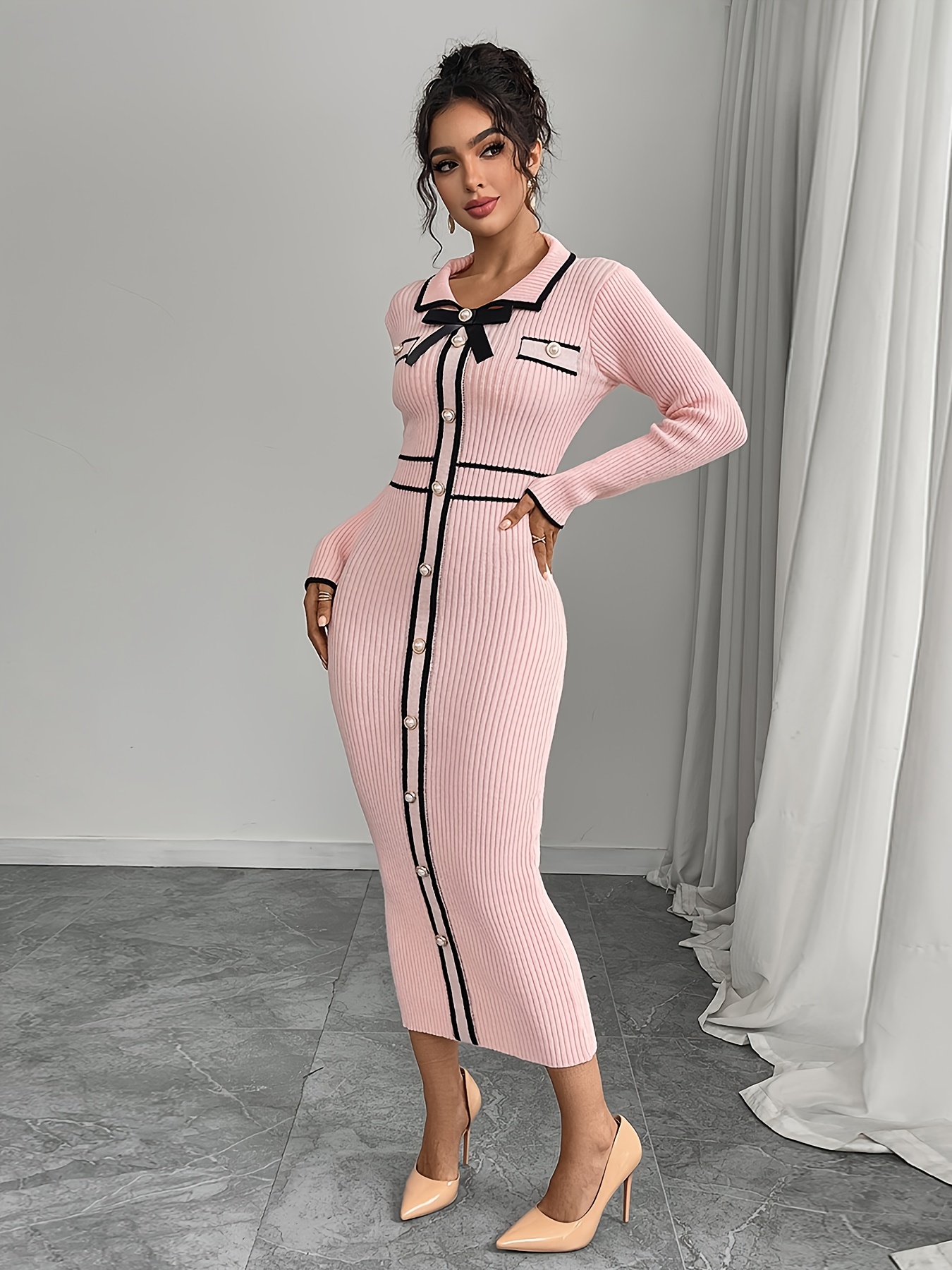 Women'S Elegant Dress - Soft Pink Formal & Casual Outfit with Button Front, Flattering Fit for Office, Parties, Tea Dates - Chic Women'S Clothing, Office Attire, Sophisticated Design, Premium Quality, Bow Detail, Fashion Lovers