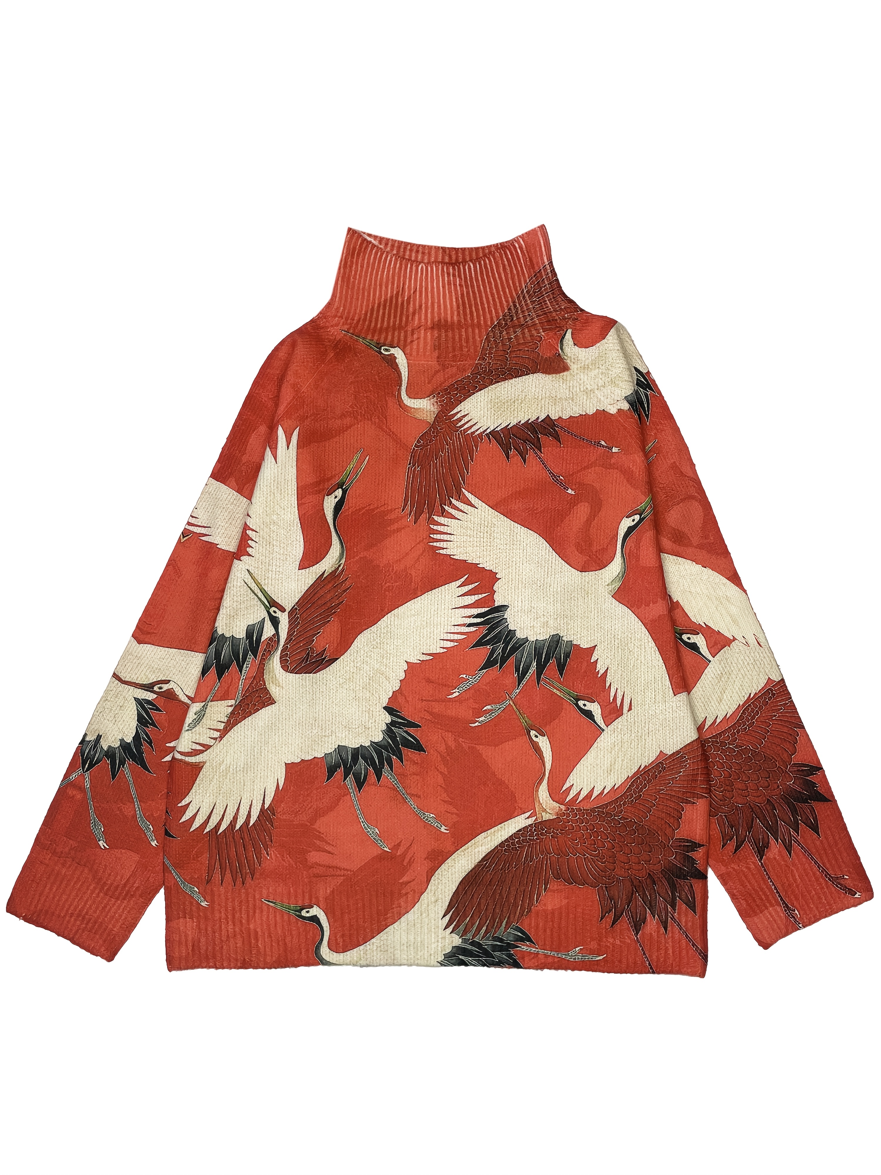 Women's Elegant Turtleneck Sweater - All-Over Crane Print in Red/Beige/Black/White, Soft Warm Pullover for All Seasons, Casual & Formal Wear, Turtleneck Sweater, Allseason Apparel, Highneck Design, Textured Knitwear, Quality Craftsmanship