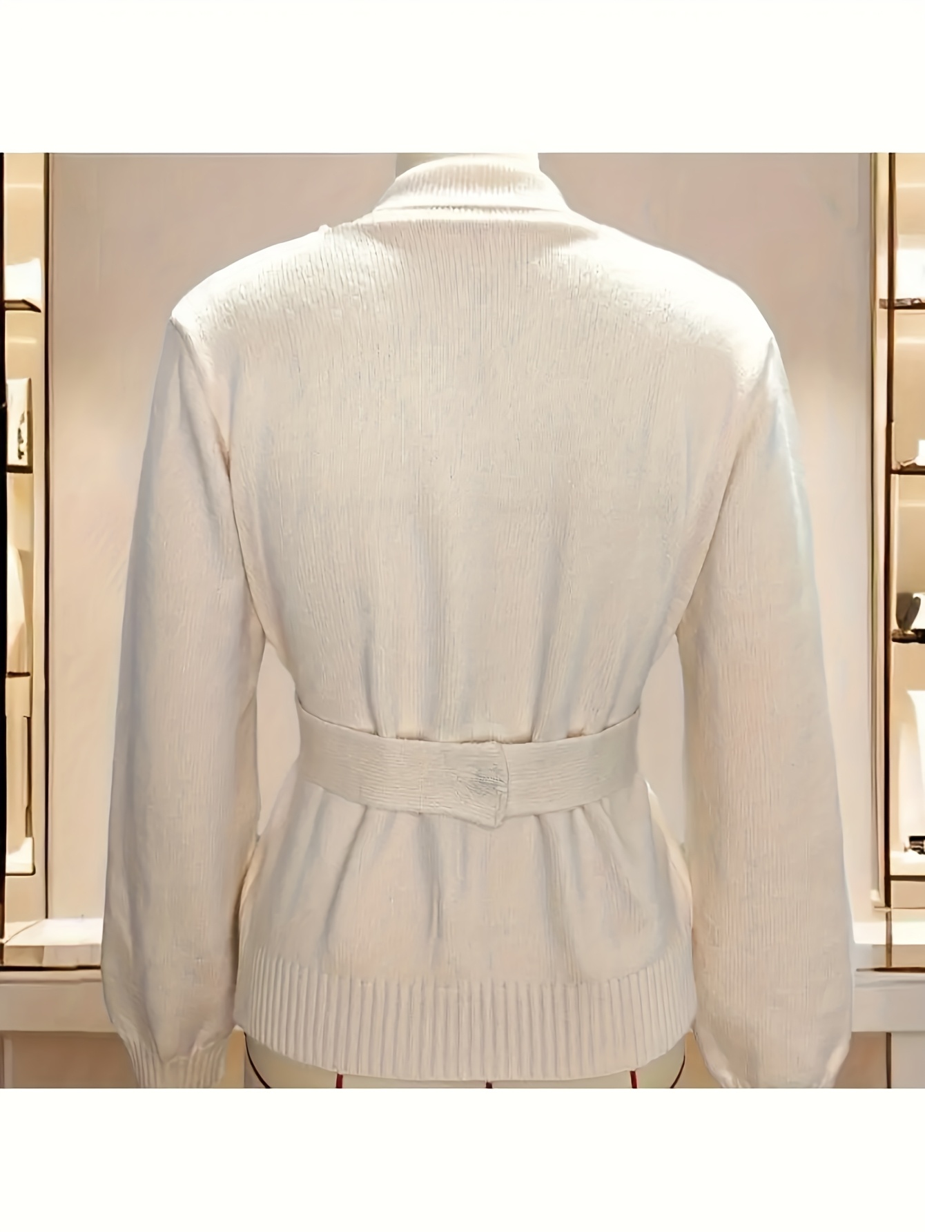 Women's White V-Neck Adjustable Belted Cardigan with Golden Buckle Detail - Soft Long Sleeve Elegant Casual Layering Pullover for Spring and Autumn, Fashionable Weekend Wear